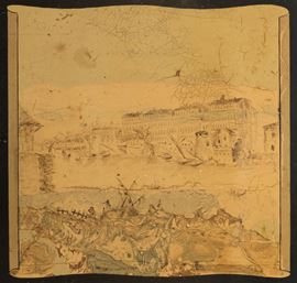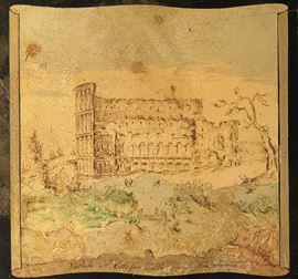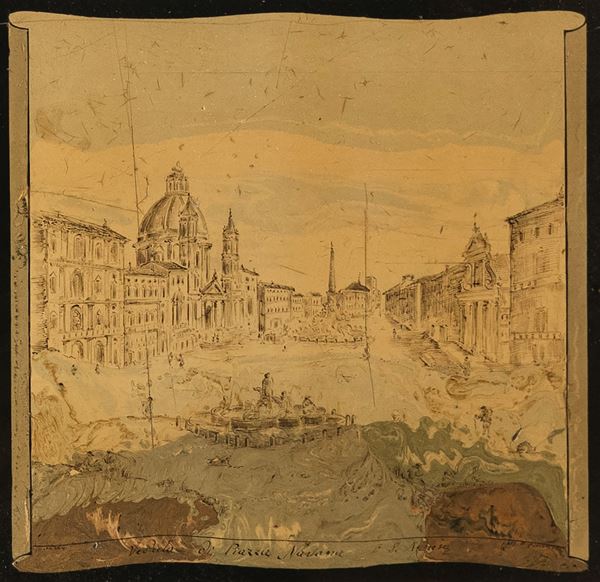 Rectangular in form, the black and gilt borders are richly decorated with mythological figures, putti, and geometric motifs. The three finely executed central panels feature polychrome views of the Colosseum, Piazza Navona, and the Port of Vespasian.