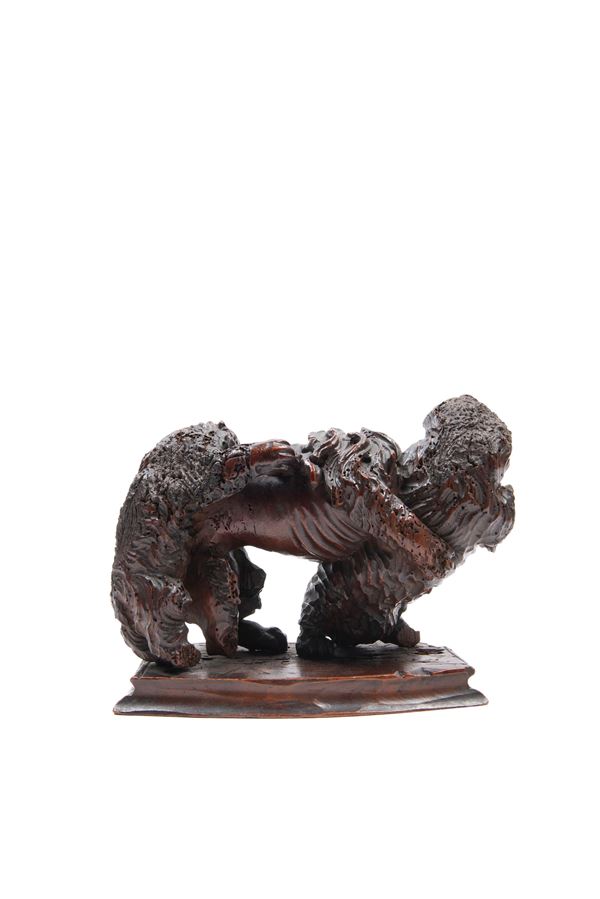 Finely carved, the sculpture depicts a lion engaged in combat with two dogs, with the eyes of both the lion and the dogs inlaid in ebony (defects).