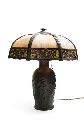 The lamp features an opalescent slag glass domed shade with a metal filigree depicting pine branches and cones, while the base is adorned with relief leaves.