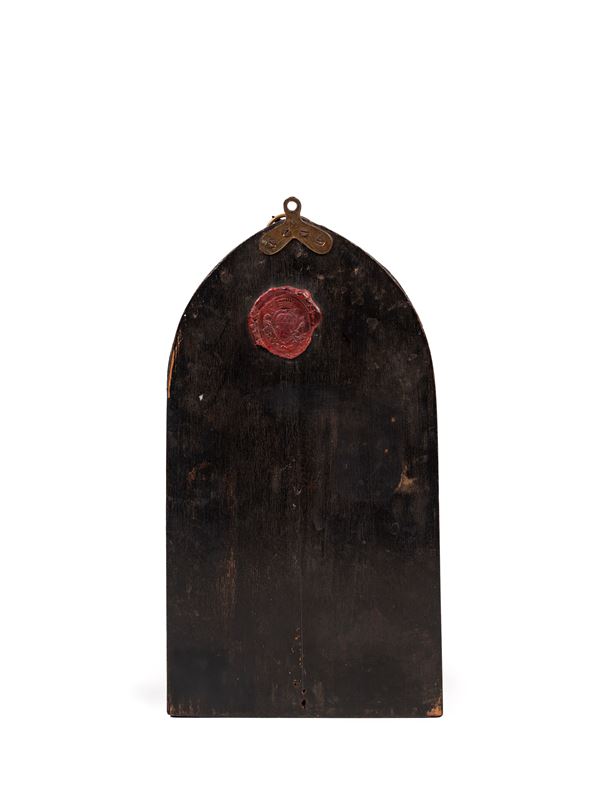 ANTIQUE LIMOGES ENAMEL PLAQUE DEPICTING THE MADONNA WITH JESUS AND SAINT JOHN THE BAPTIST