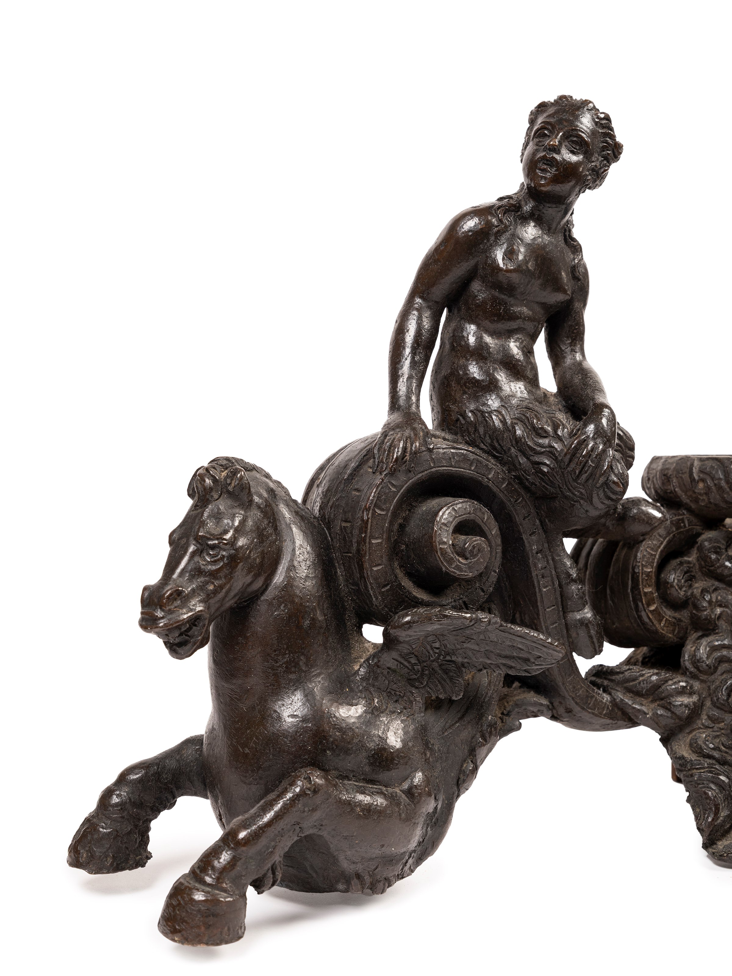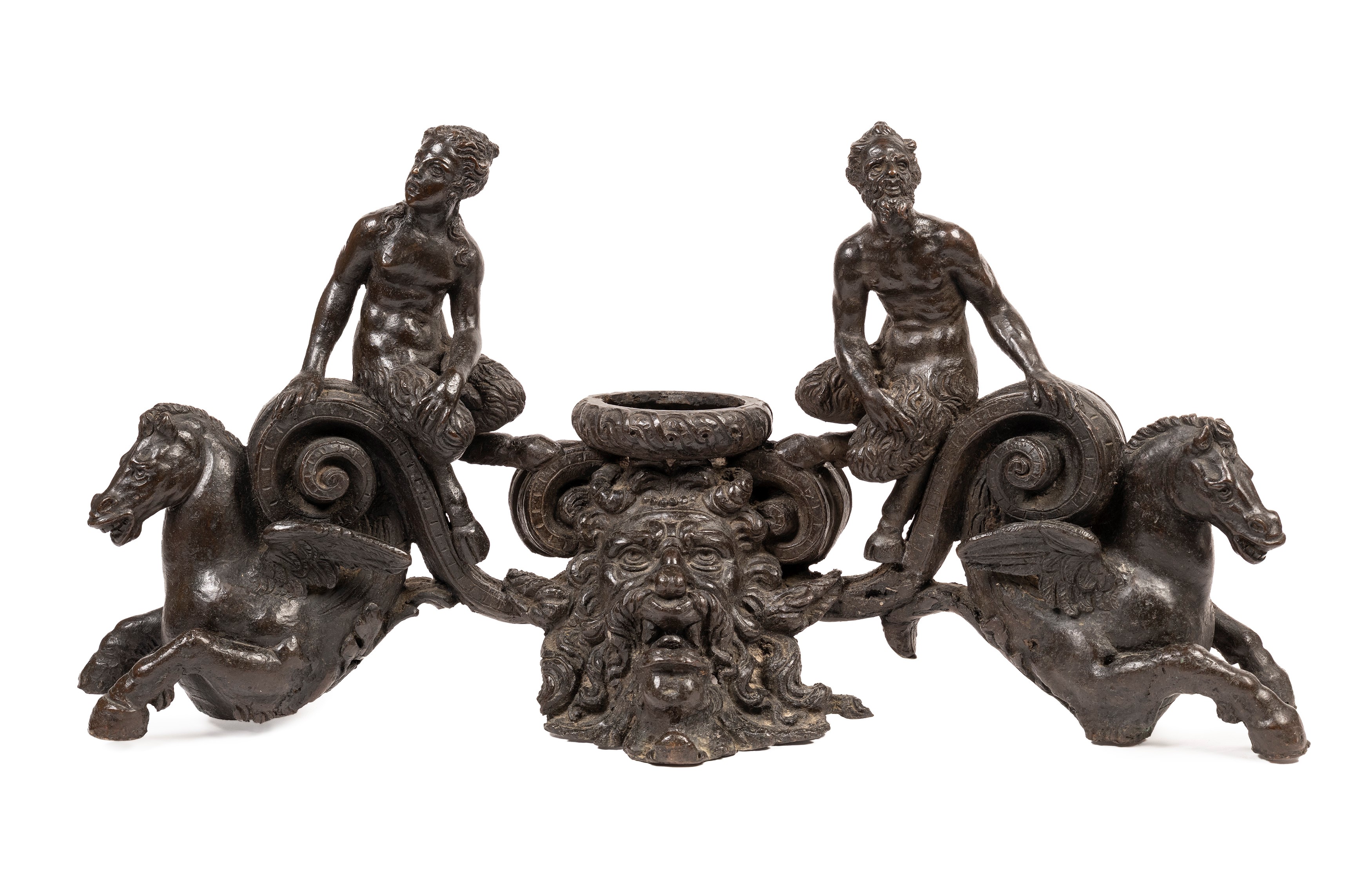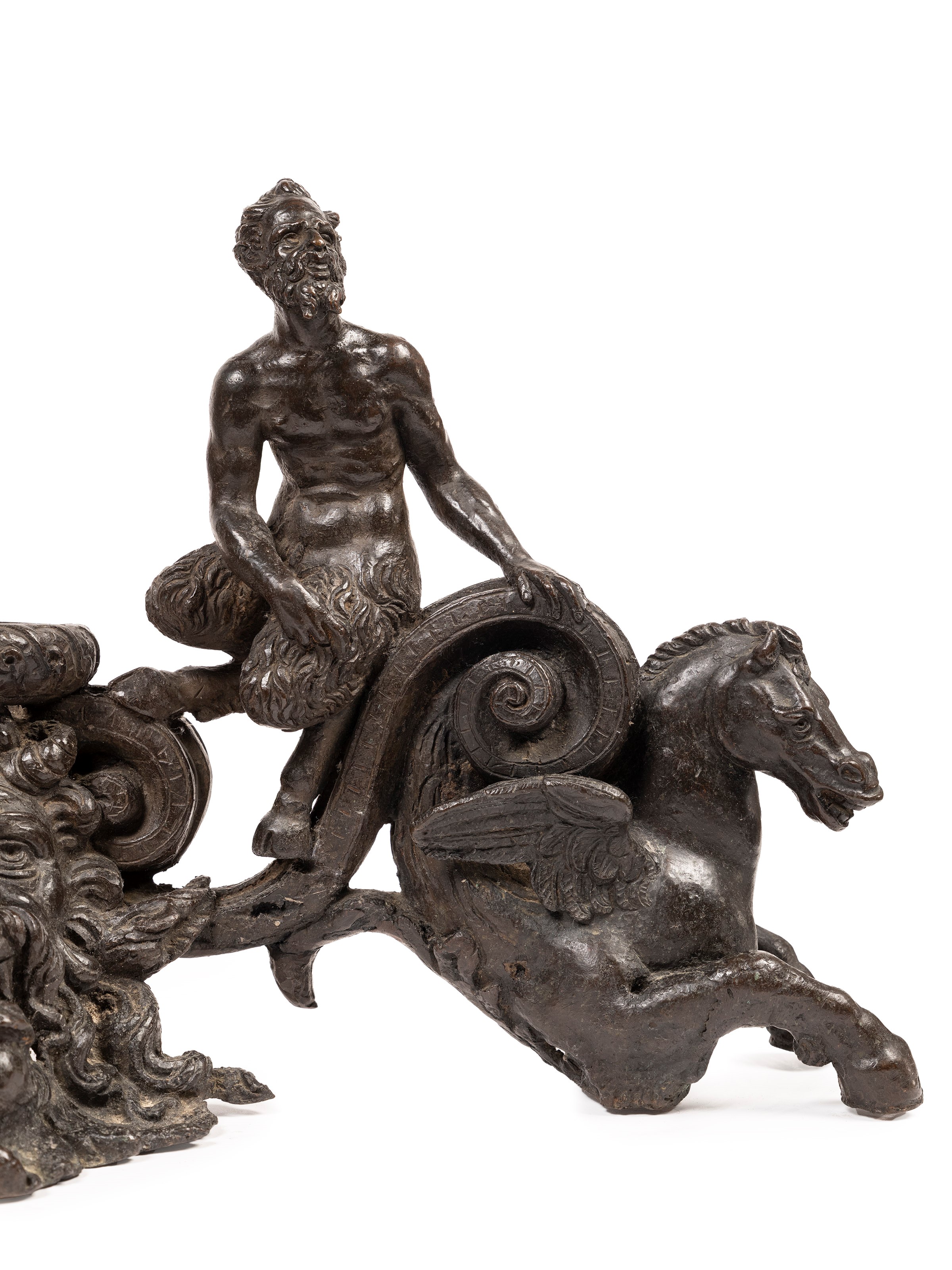 Renaissance Venetian bronze andirons with a dark patina, depicting two seated satyrs atop large winged horses, centred by a grotesque mask.