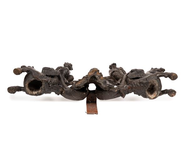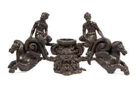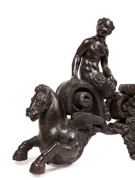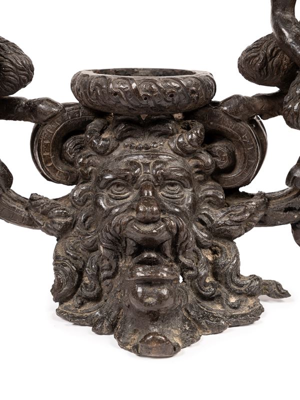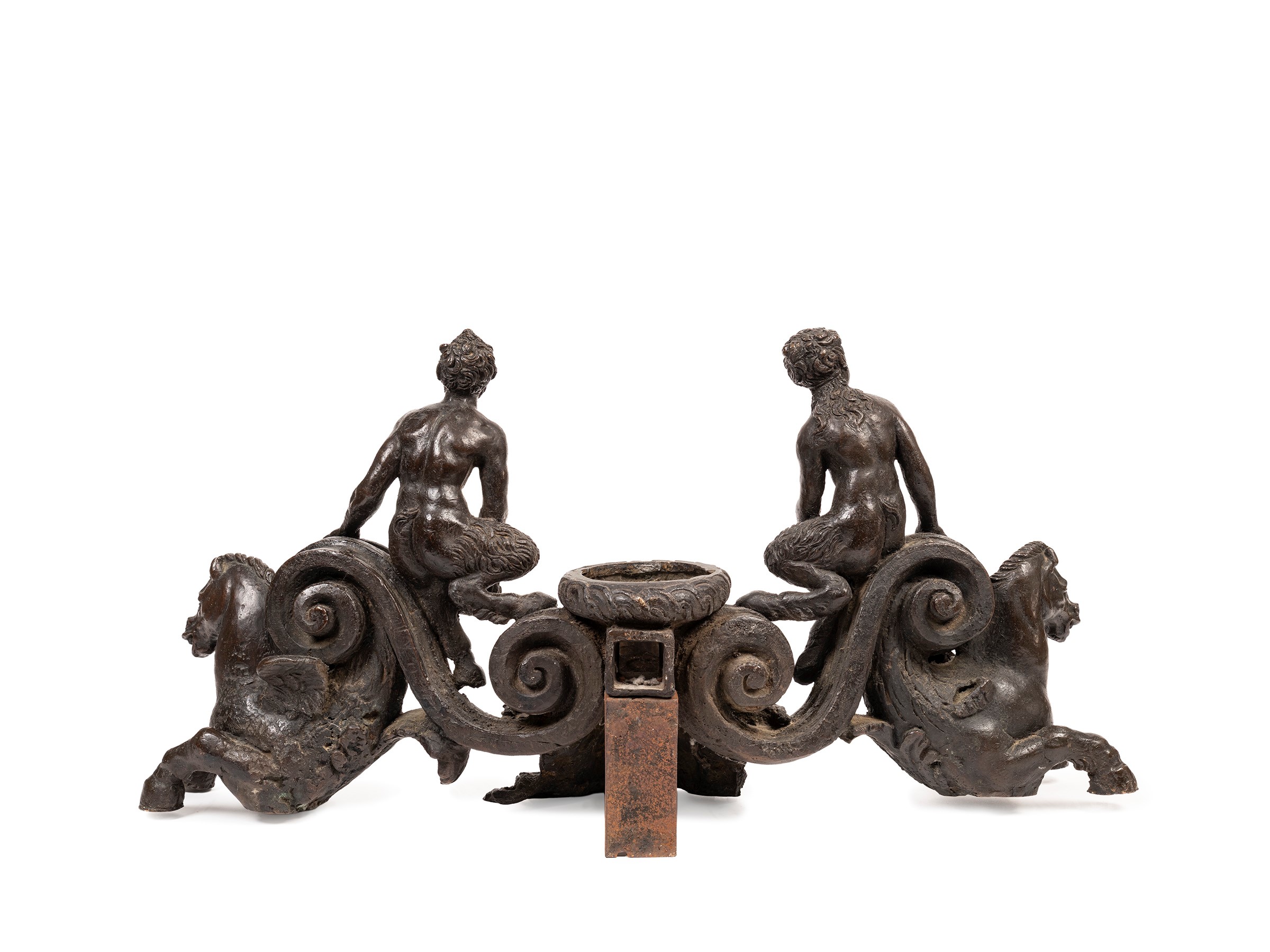 Attributed to Andrea di Bartolomeo, known as il Bresciano, on the basis of the refined modelling and the elegance of the decorative scheme. Of particular significance is the central grotesque mask, whose plastic treatment and dramatic expression find a direct comparison with the masks on the firedogs from the celebrated Bute Collection, suggesting a shared stylistic and formal matrix.