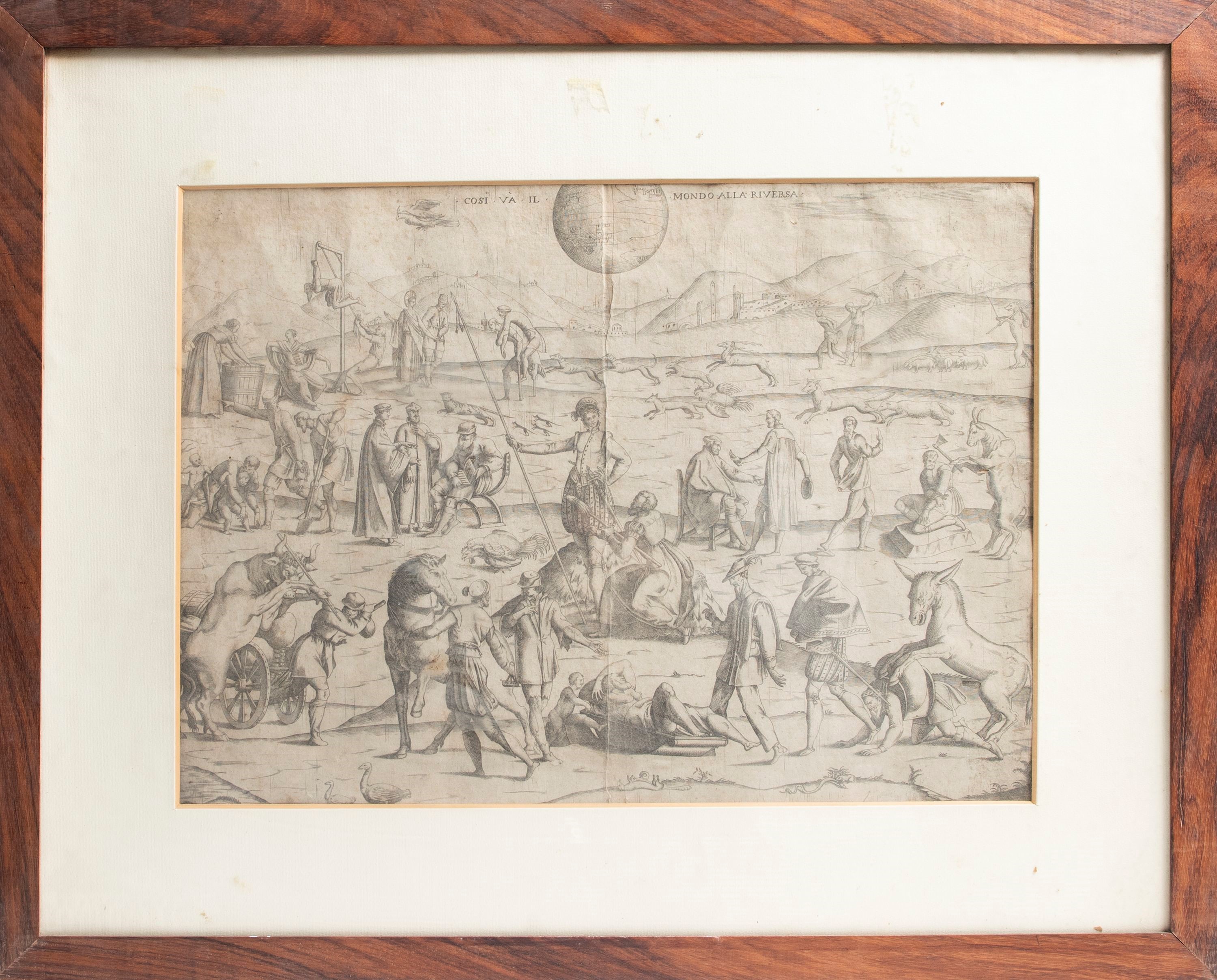 The print titled “COSÌ VA IL MONDO ALLA RIVERSA” is a classic example of the “world turned upside down” theme, popular in European imagery from the 16th to the 18th century. It depicts various scenes in which social and natural hierarchies are inverted, offering a satirical or moral commentary on the perceived disorder of society.