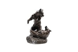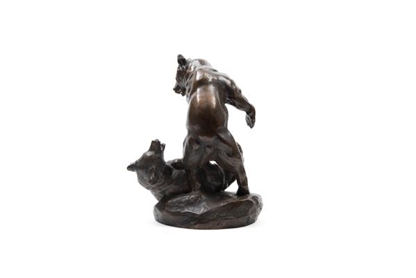 Depicting a sculptural group of bears engaged in a fight, signed Markup Bela and dated 1911 on the reverse.