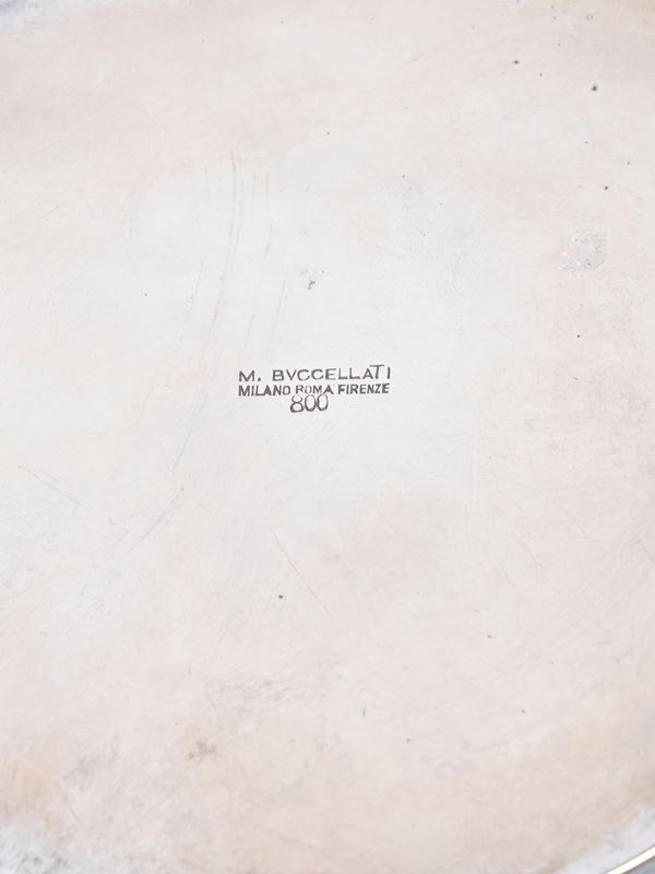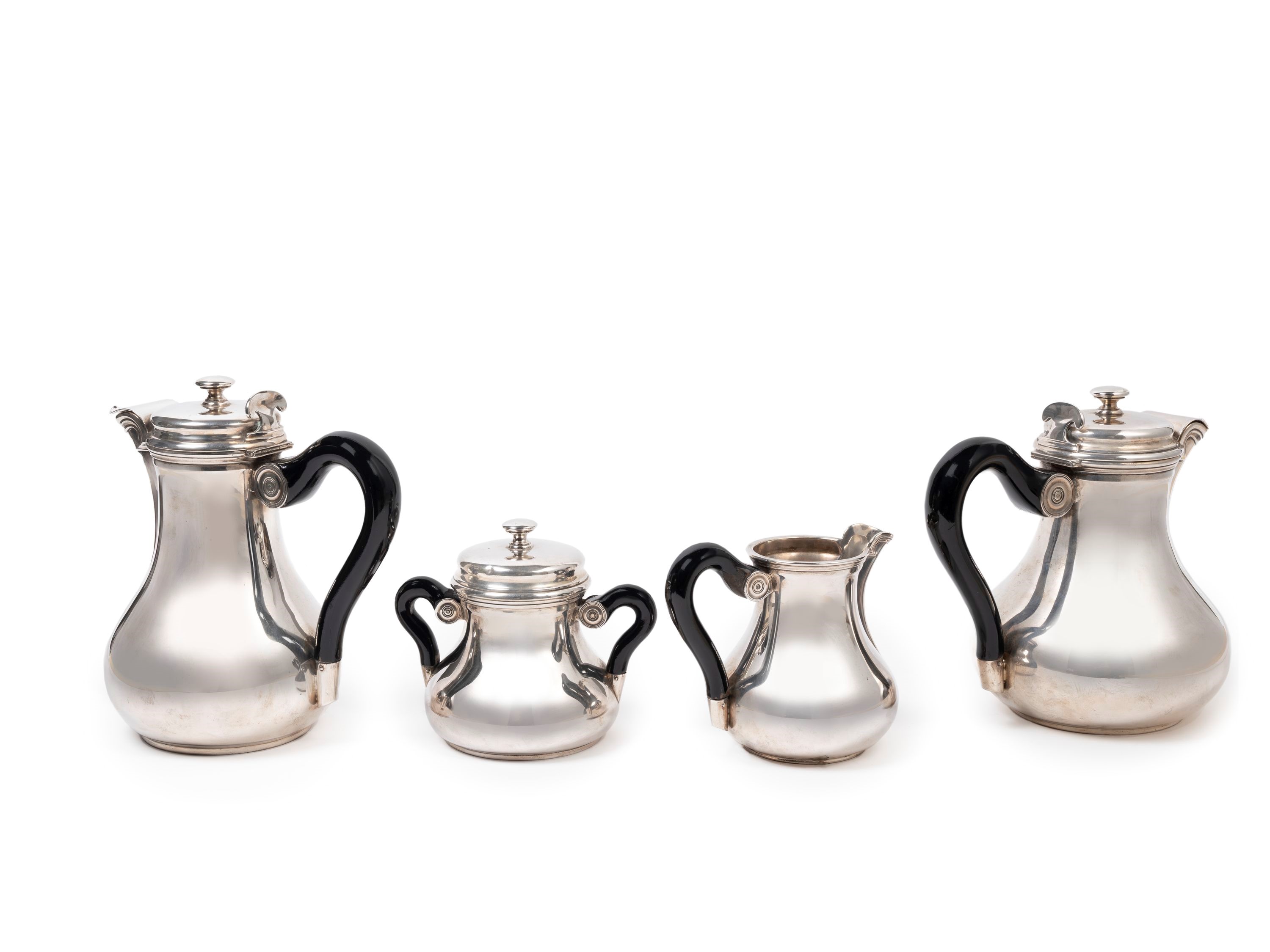 Signed M. Buccellati Milano Roma Firenze 800, comprising a teapot, a coffee pot, a sugar bowl and a milk jug, cast and shaped, with turned wooden handles. Weight 2595 g.