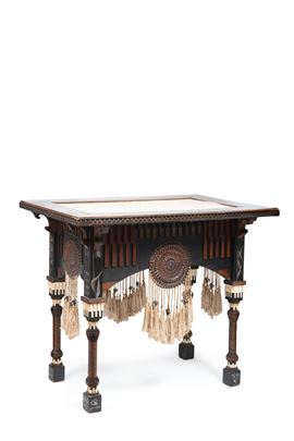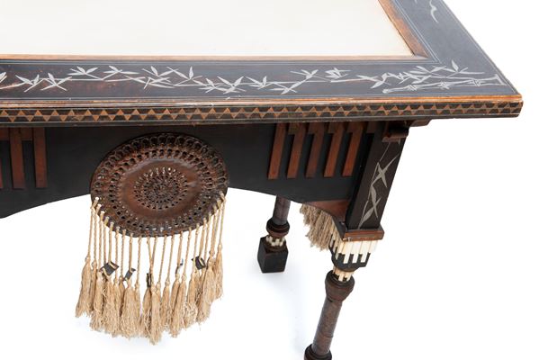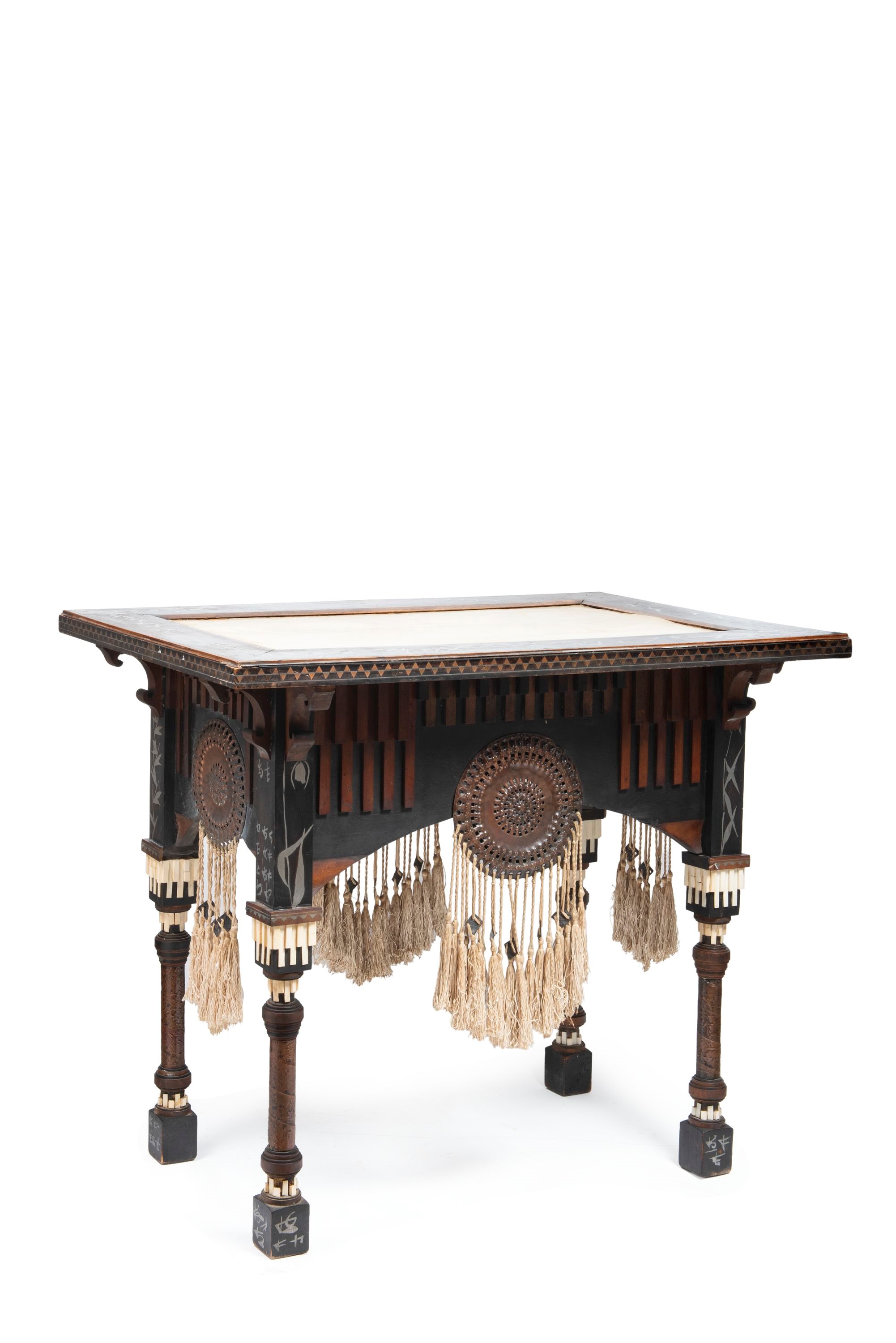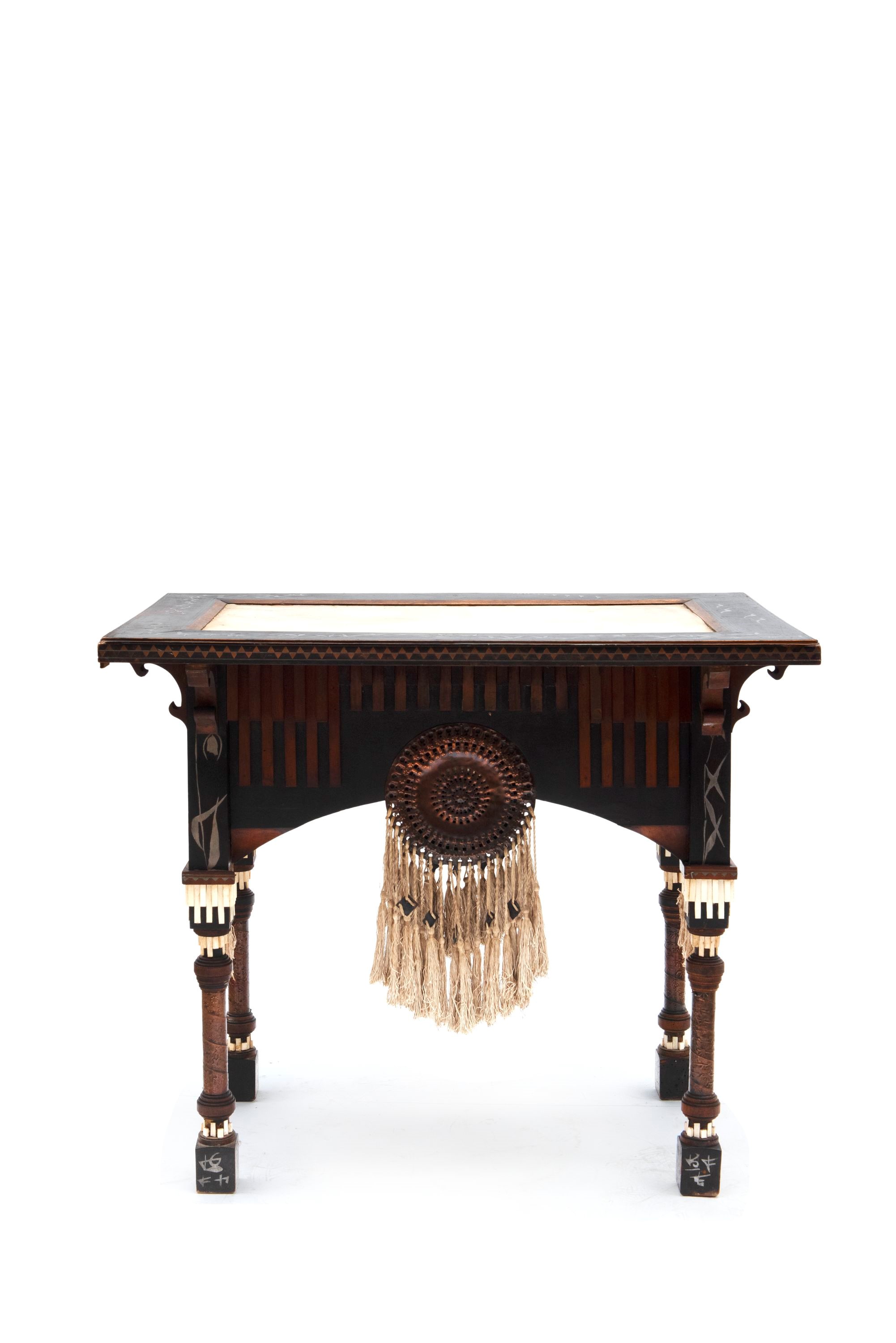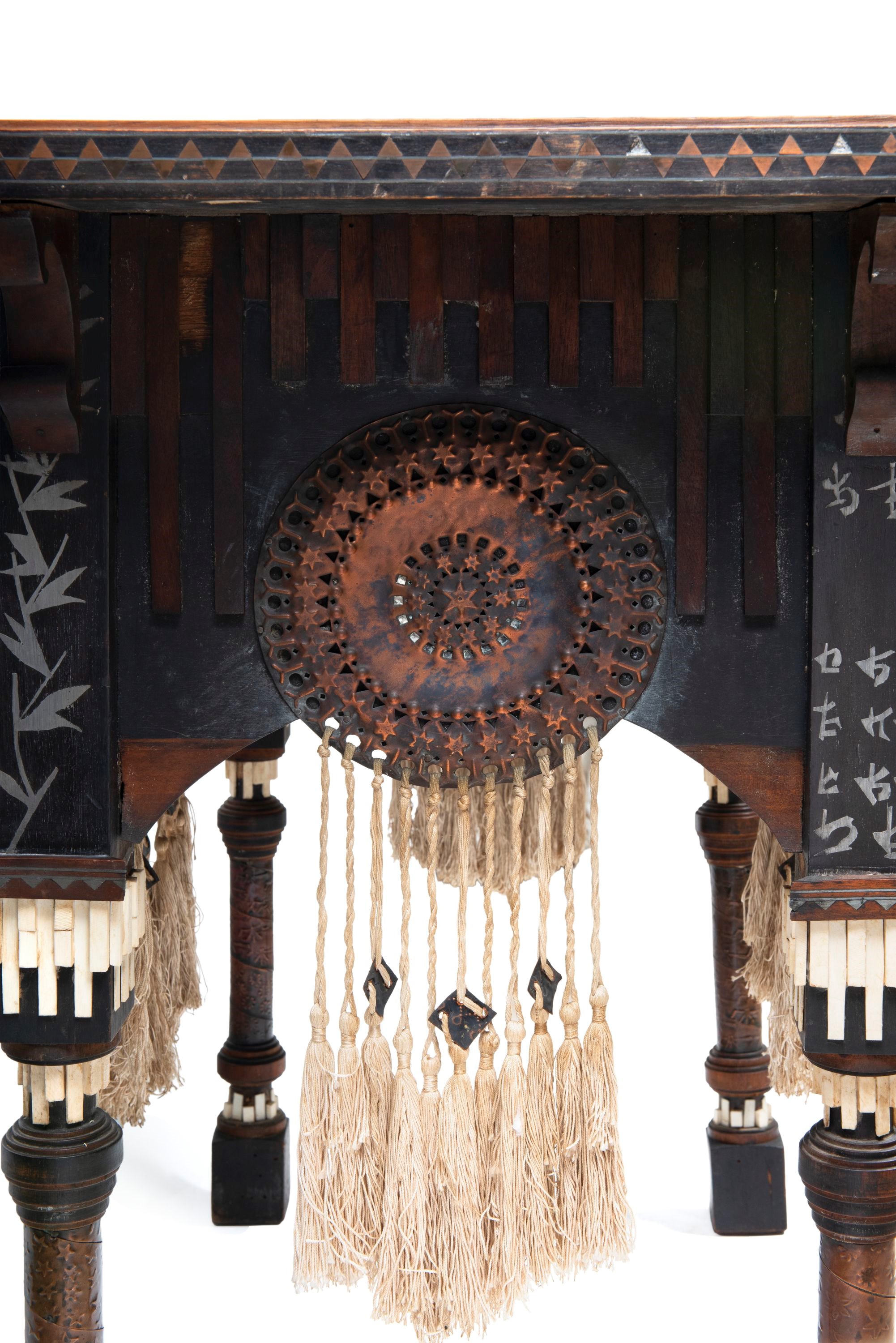 Ebonized wood, parchment, inlaid pewter, hammered copper, bone, silk tassels.