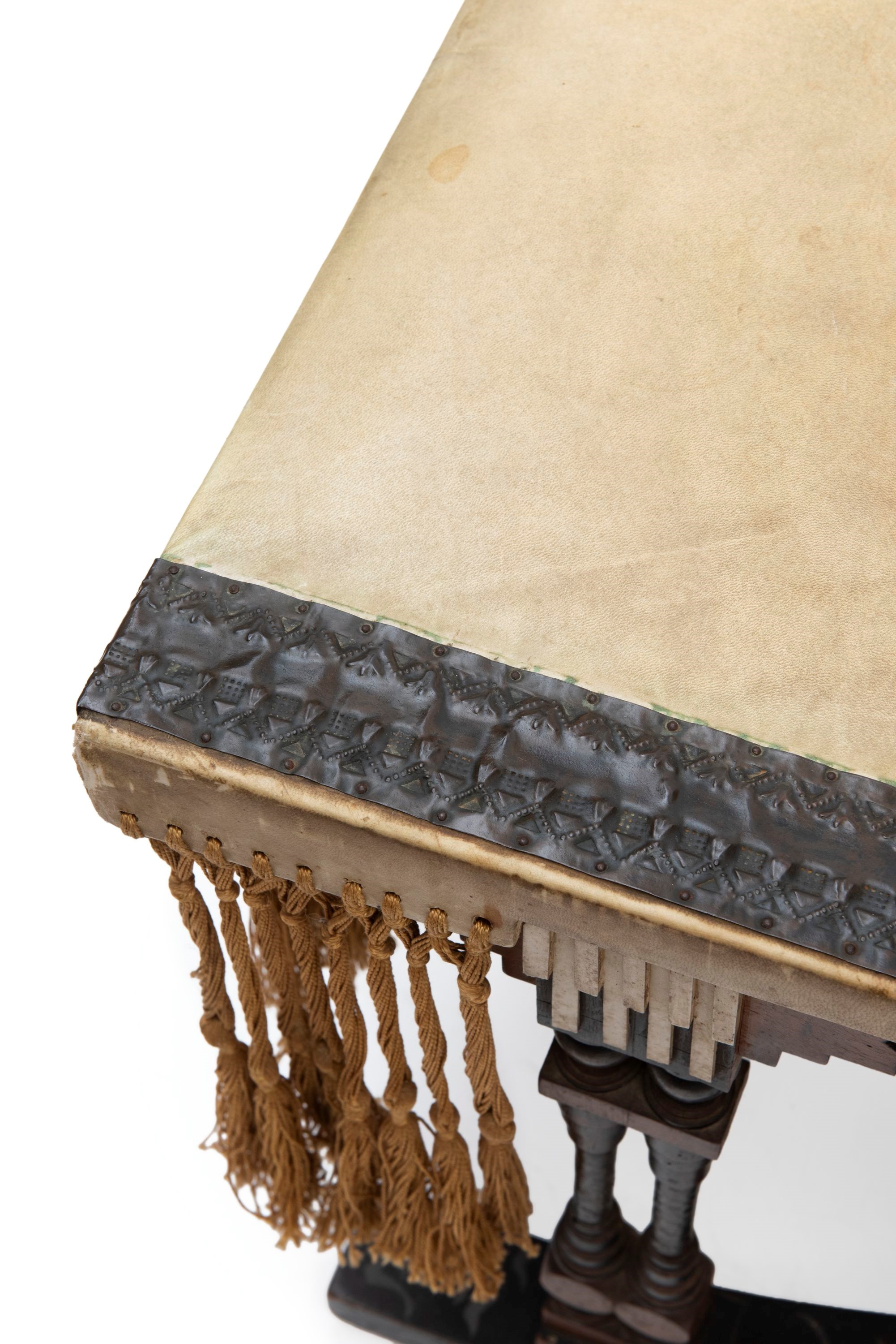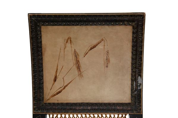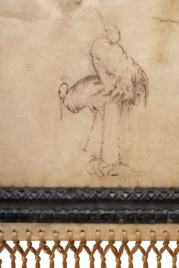 Constructed in wood and ebonized wood, enhanced with panels of hand-painted vellum depicting storks and sheaves, foliate pewter inlays, chased copper and bone applications, and finished with refined silk tassels.