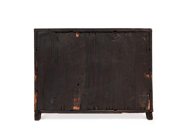 On the front, nine drawers and a central door with columns. Decorated with bone and hardstones.