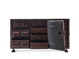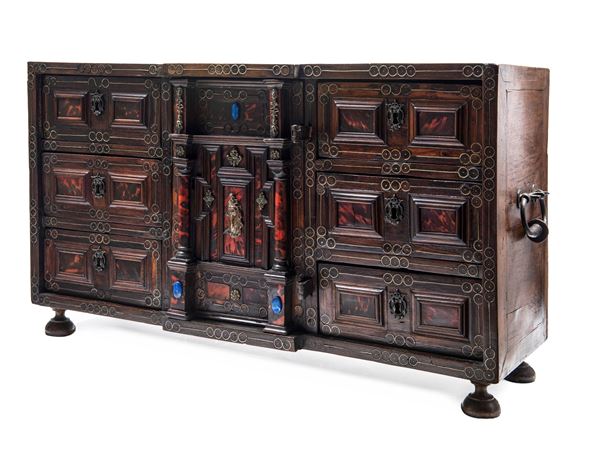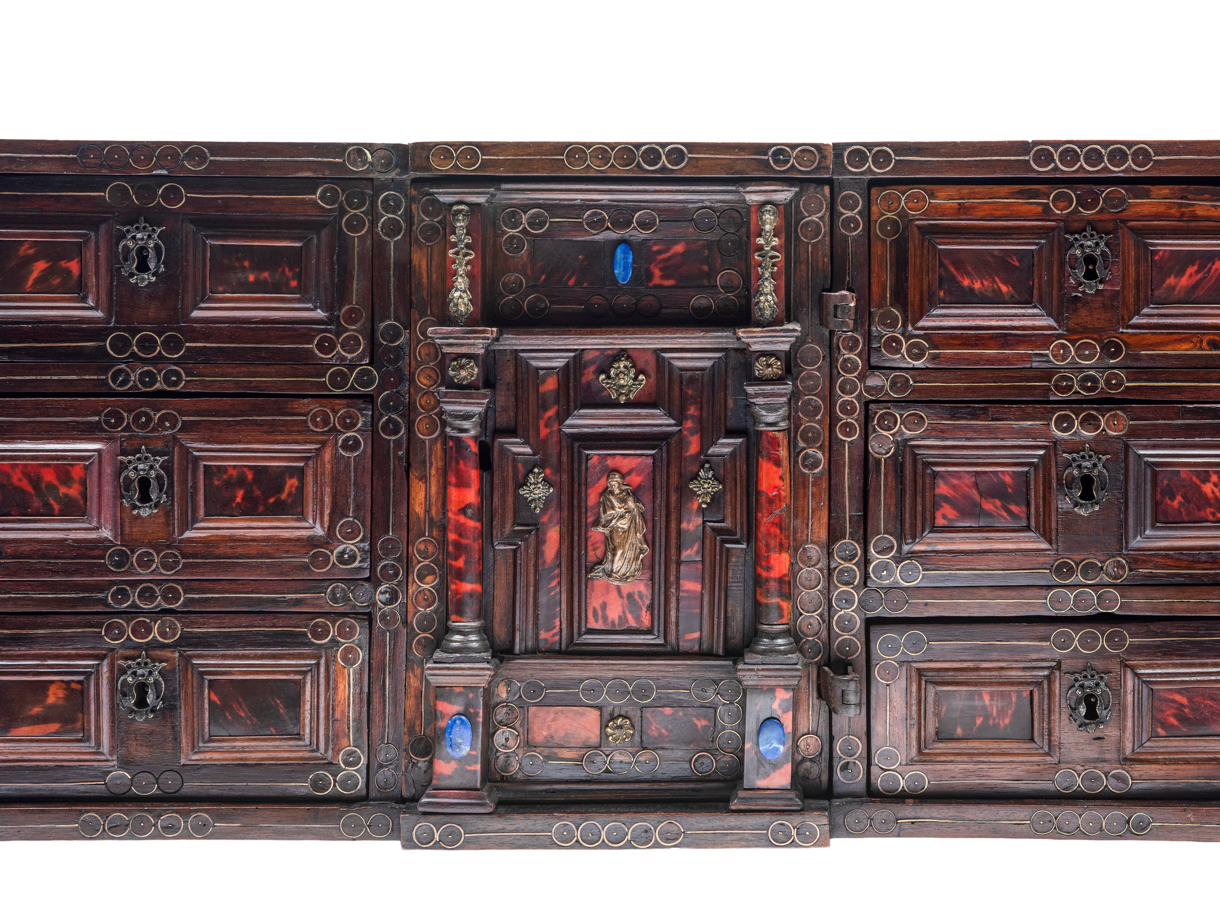 Front with six drawers and a central architectural-style drop-down door that reveals four interior drawers. Drawer escutcheons and central columns in tortoiseshell; bronze, brass, and lapis finishes; central gilded bronze plaque depicting a saint.