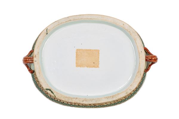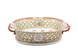 Oblong in shape with flared rim and iron-red handles, the body is openwork, the centre is decorated with flowers, the outside and inside are glazed in faux bois style and decorated with medallions and panels containing gilt flowers.