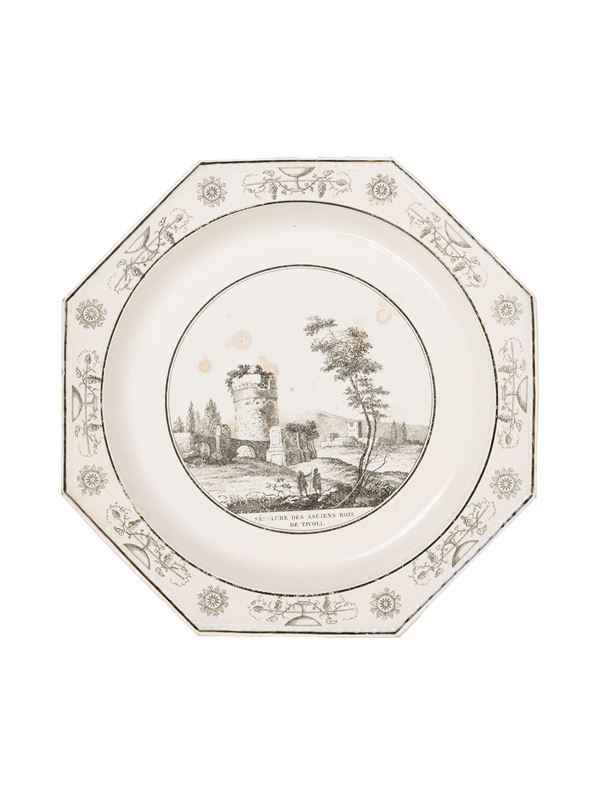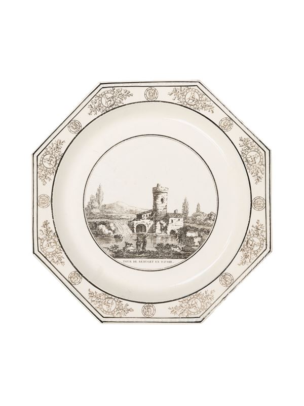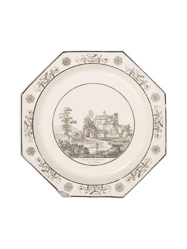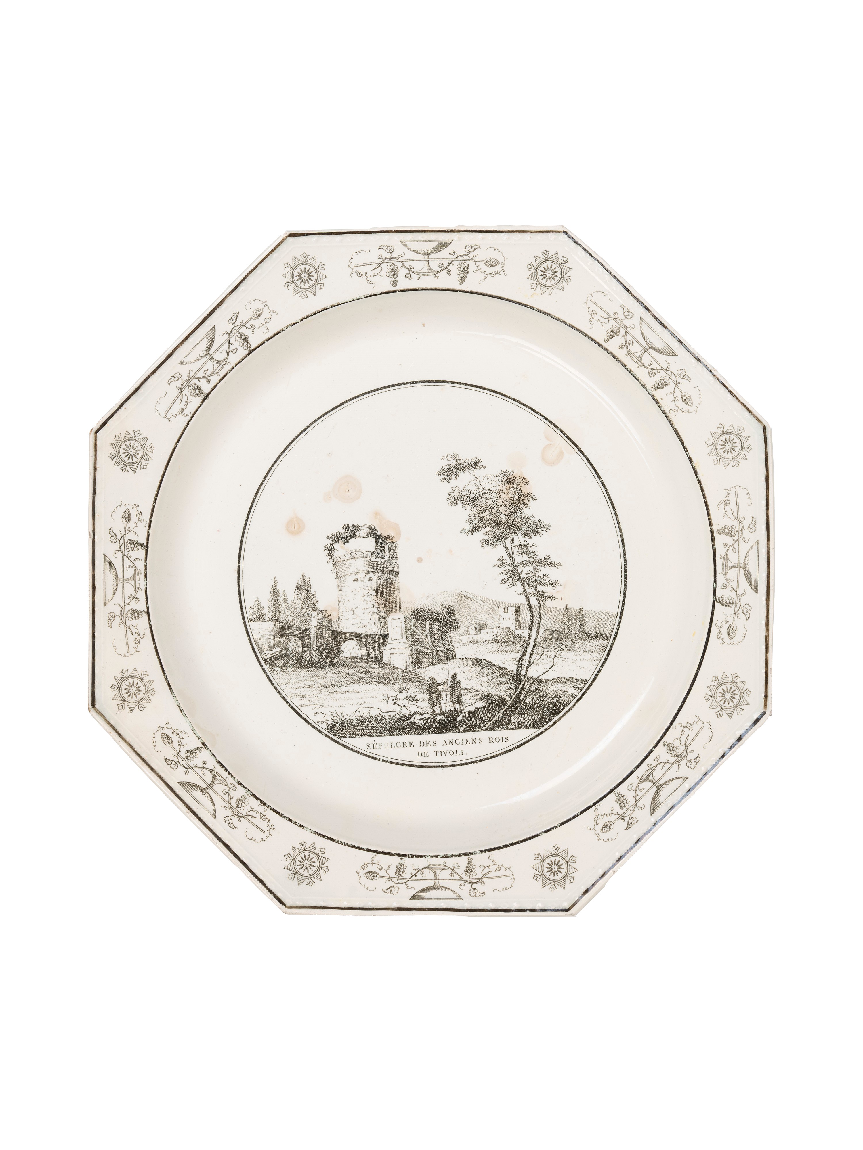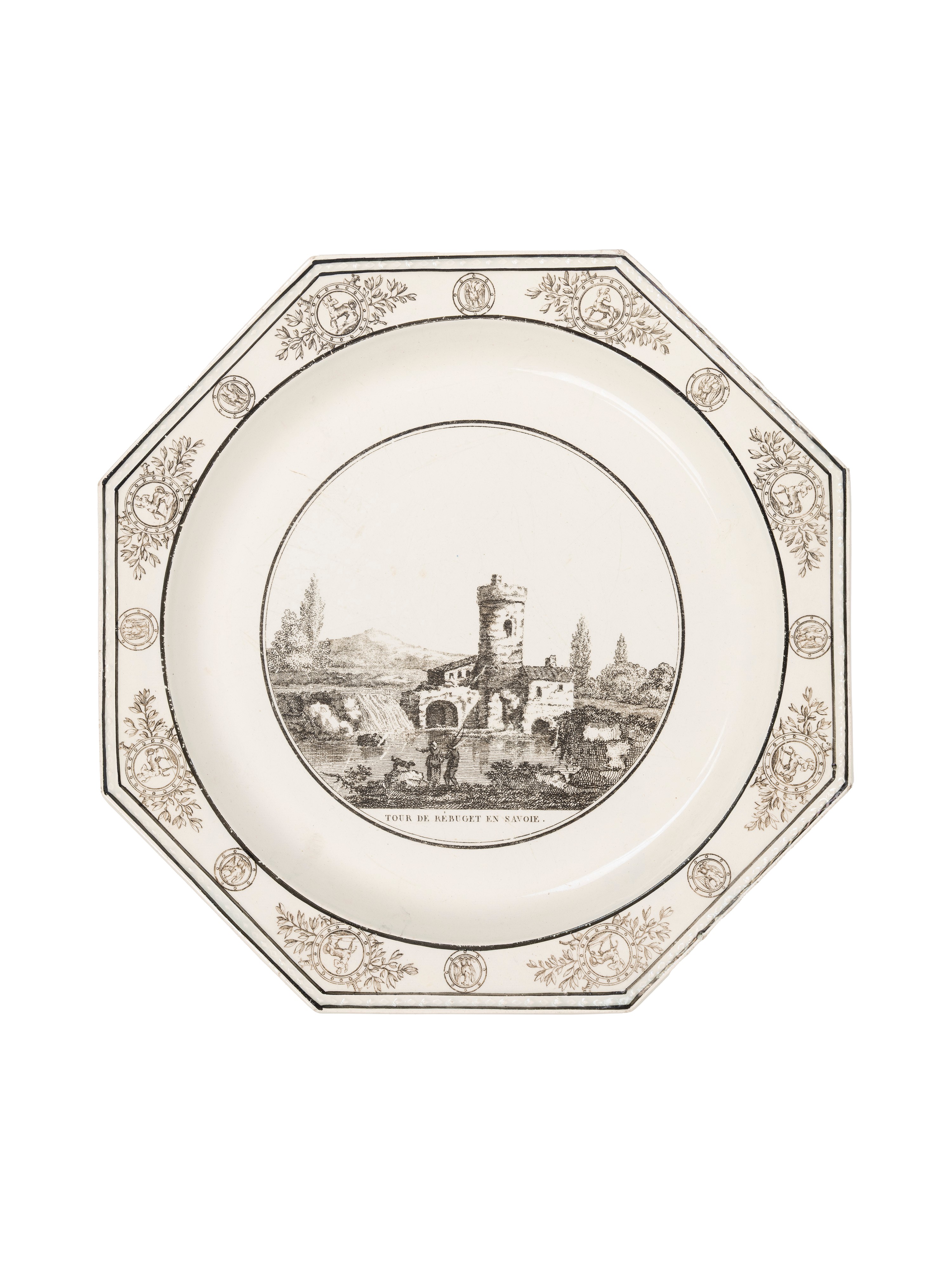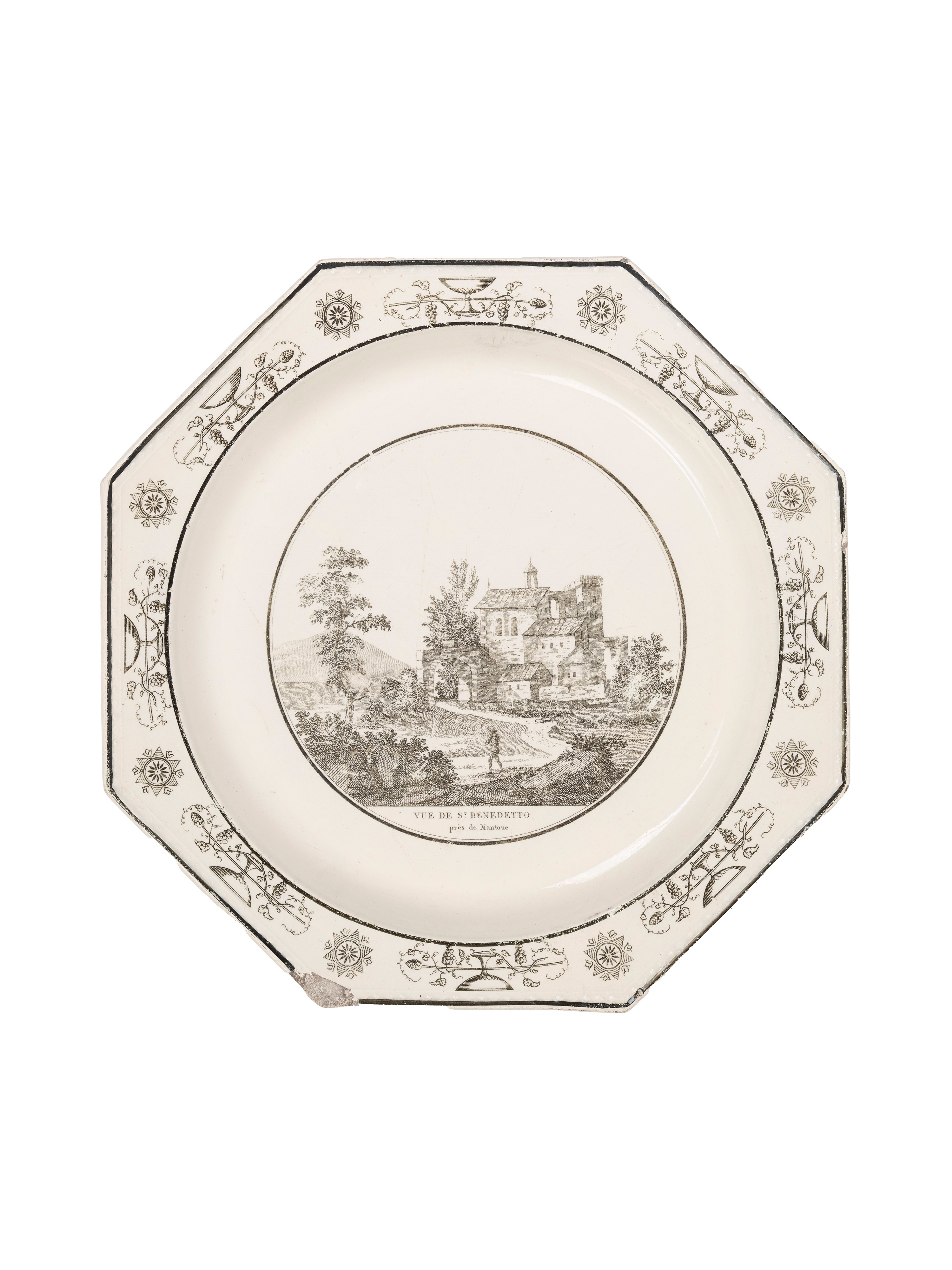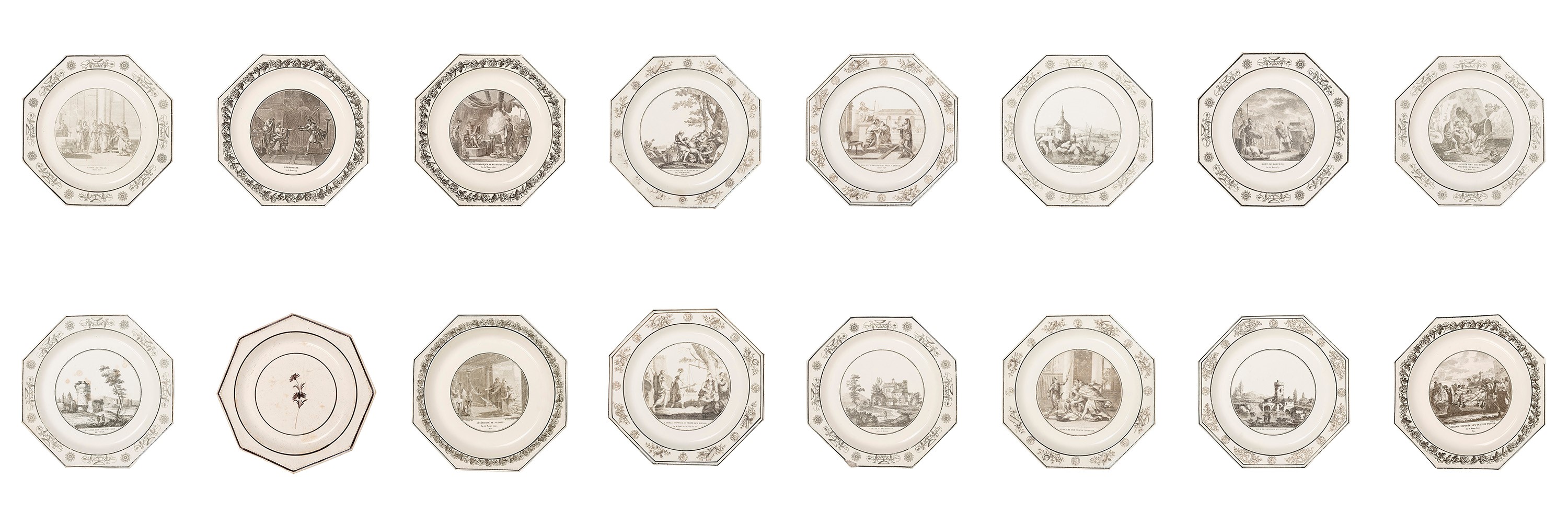 FIFTEEN MAIOLICA SAUCER PLATES WITH VIEWS AND ONE WITH A FLOWER, Montereau Faience, early 20th century