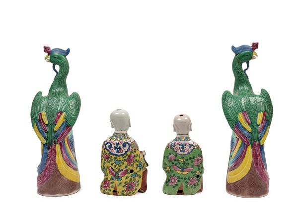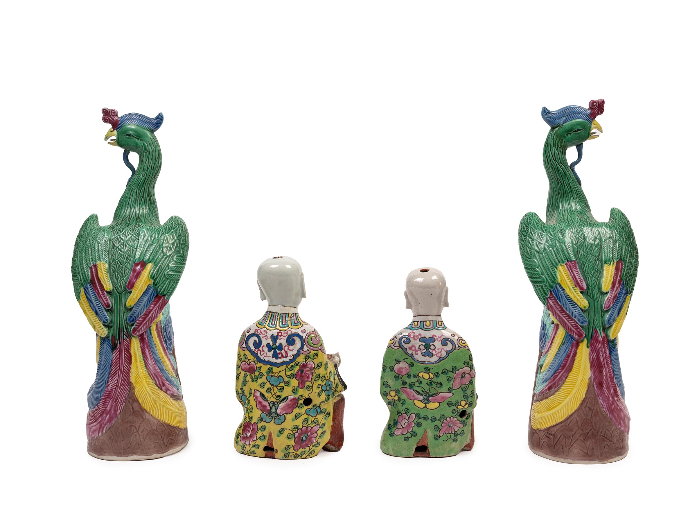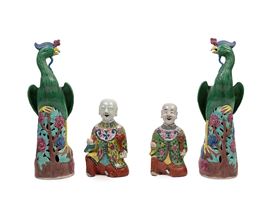 One pair in famille rose porcelain depicting children, and one pair depicting phoenixes.