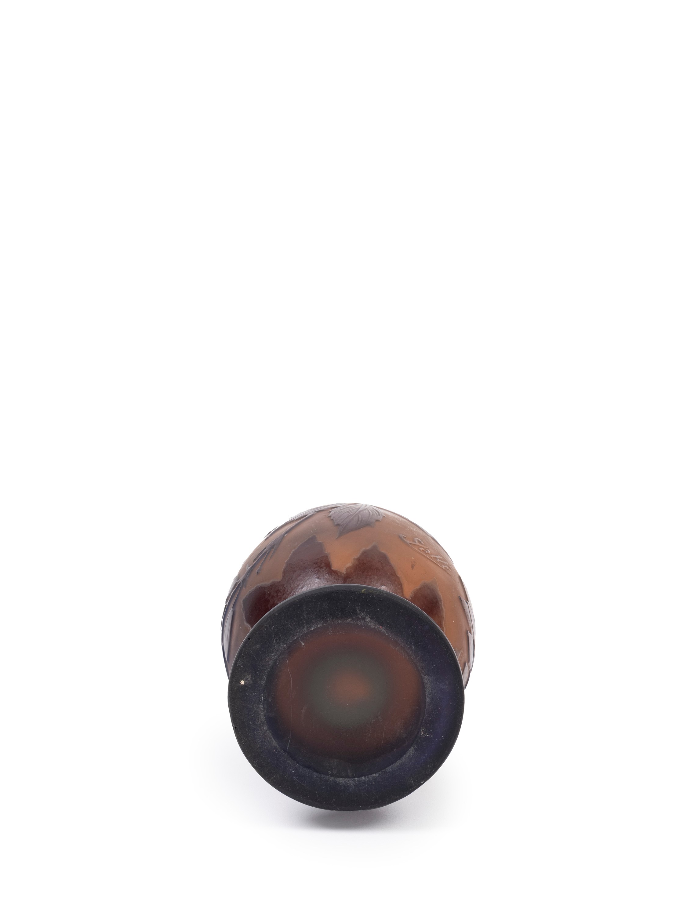 Bulbous in shape, tapering to a narrow neck with a small flared rim, decorated with foliate motifs.