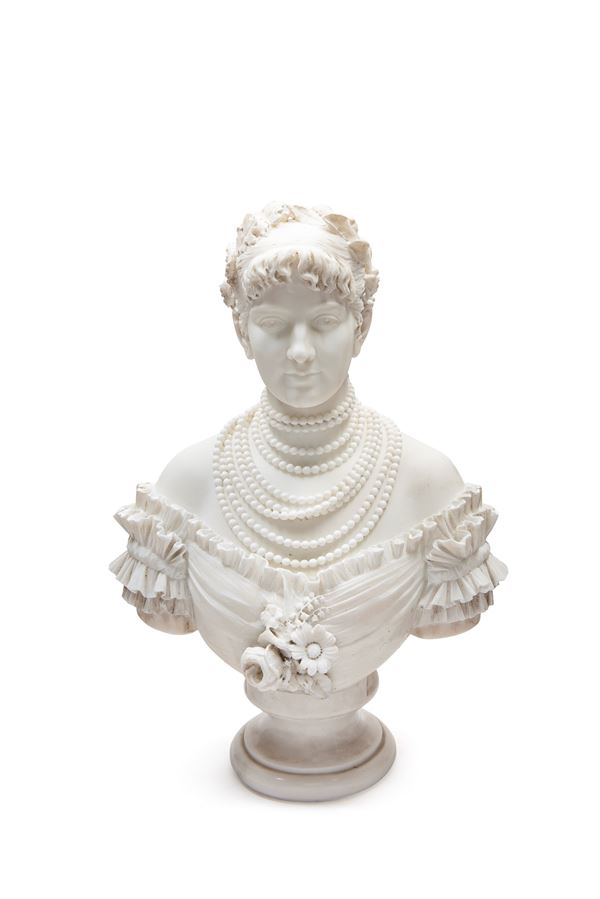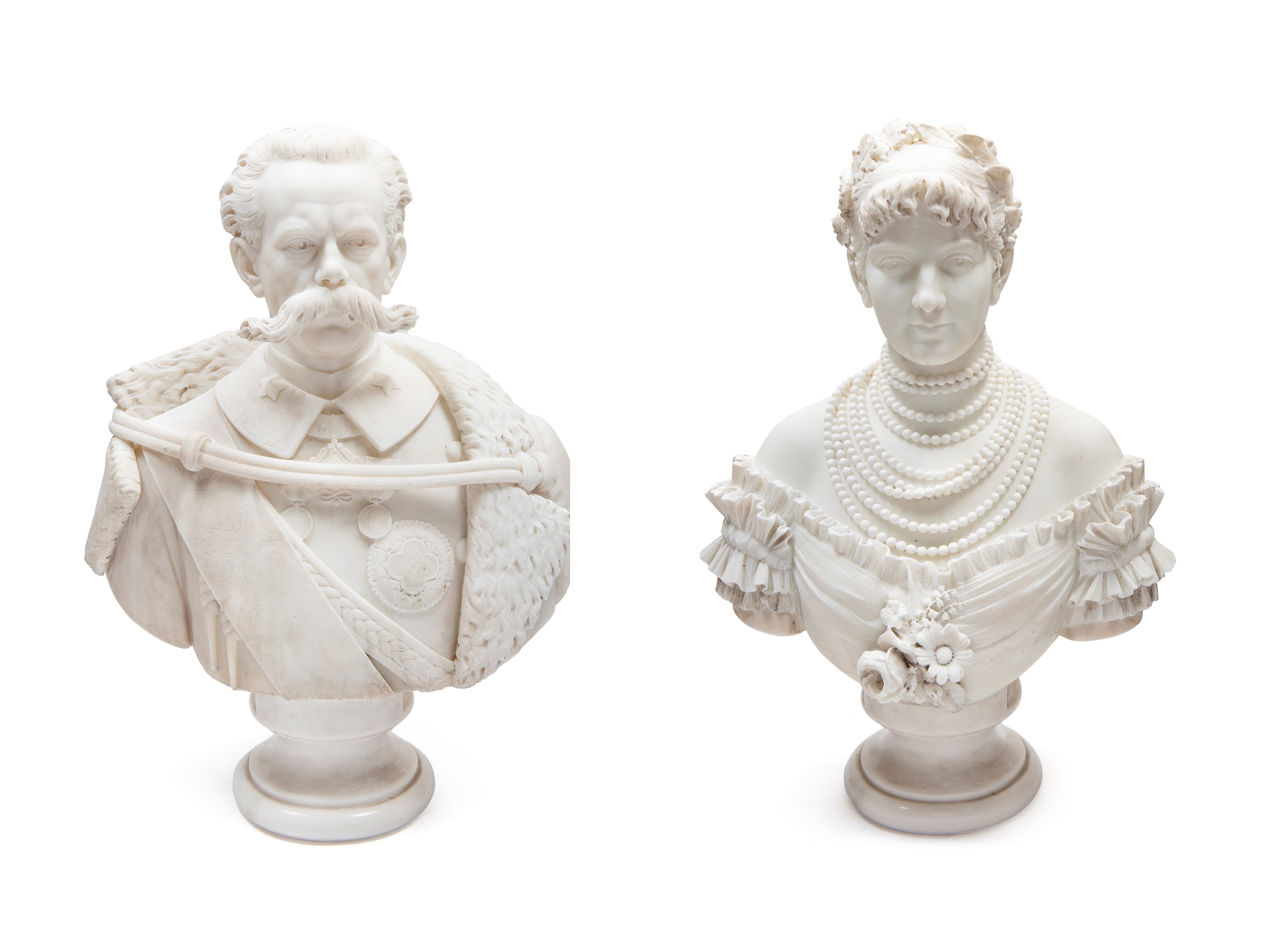 Depicting King Umberto I and his consort Margherita of Savoy. Both busts stand out for their extraordinary execution, from the meticulous rendering of the faces and the details of the attire, to the modeling of the drapery and ornaments, demonstrating the hand of a sculptor of exceptional skill.