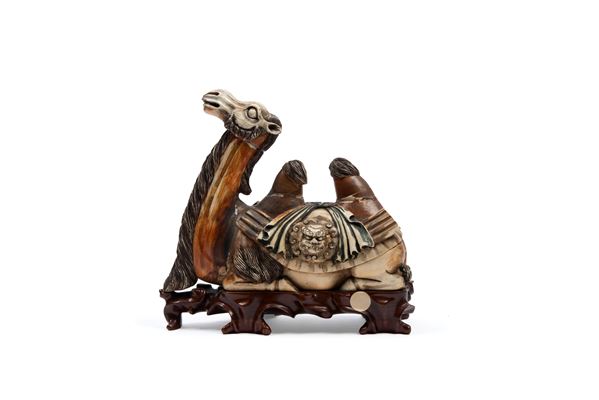 ☼IVORY SCULPTURE DEPICTING A CROUCHING CAMEL ON A WOODEN BASE, China, early 20th century