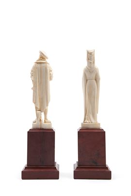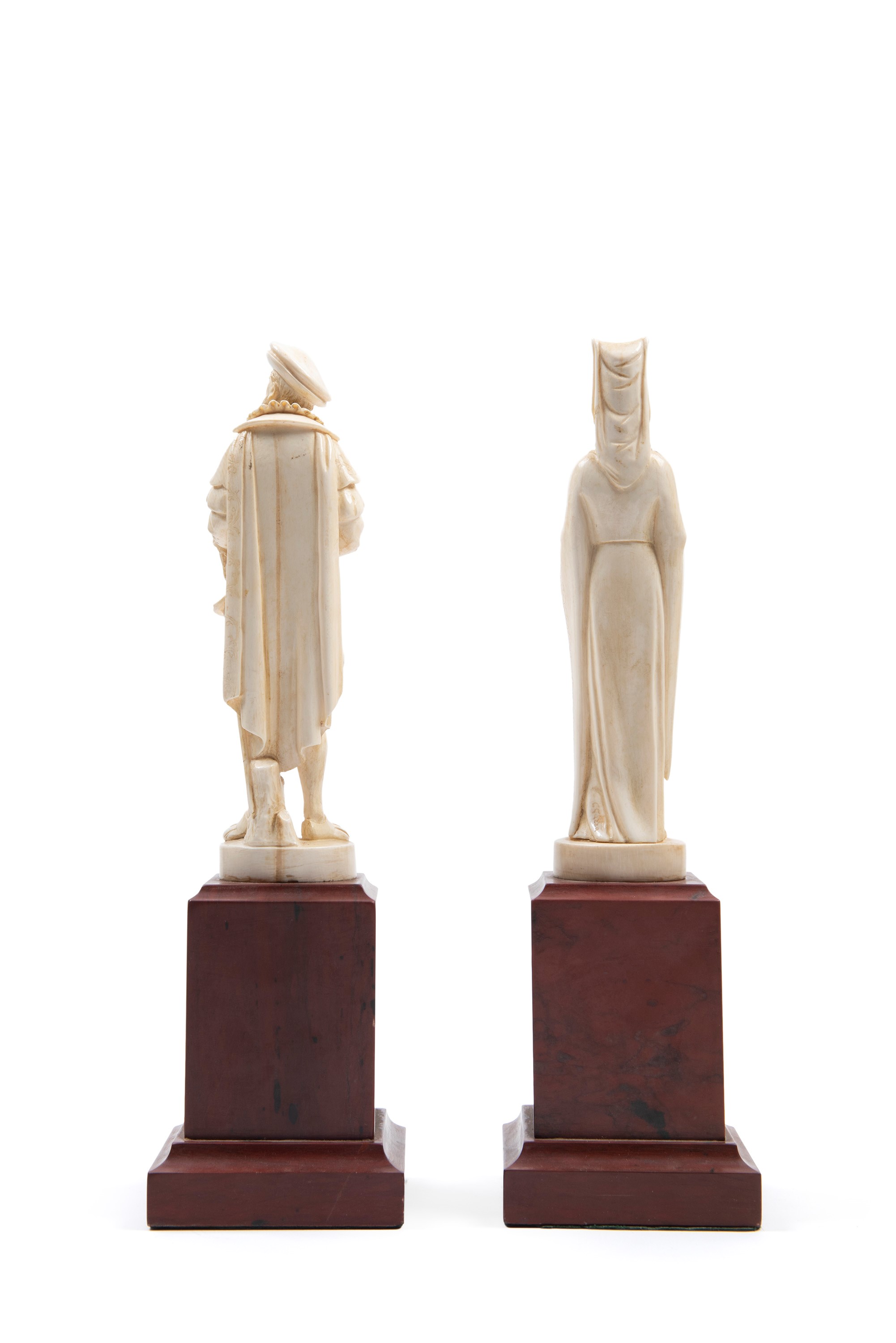 ☼IVORY SCULPTURES DEPICTING A GALLANT COUPLE IN RENAISSANCE ATTIRE ON RED MARBLE BASES, French School, 19th century