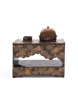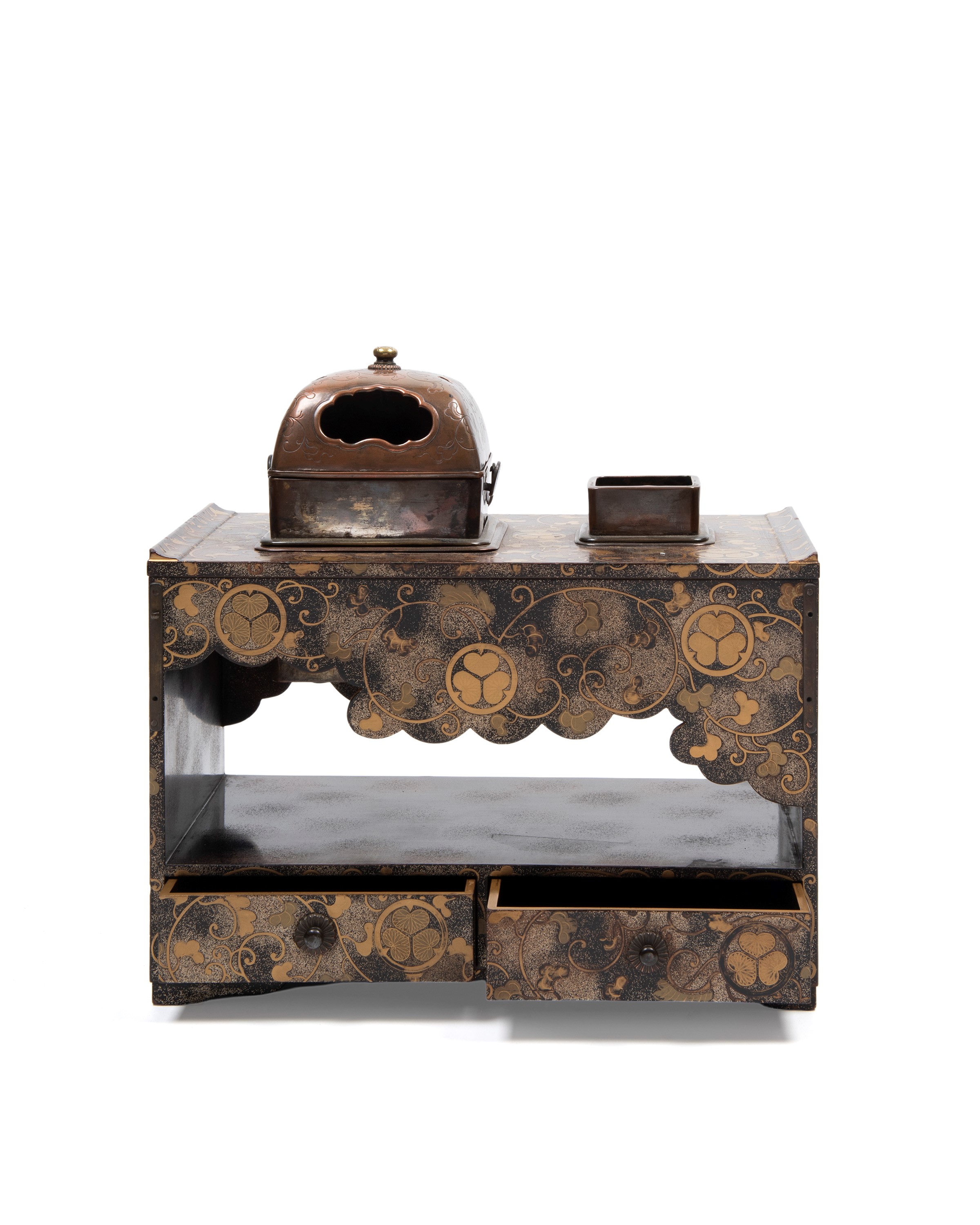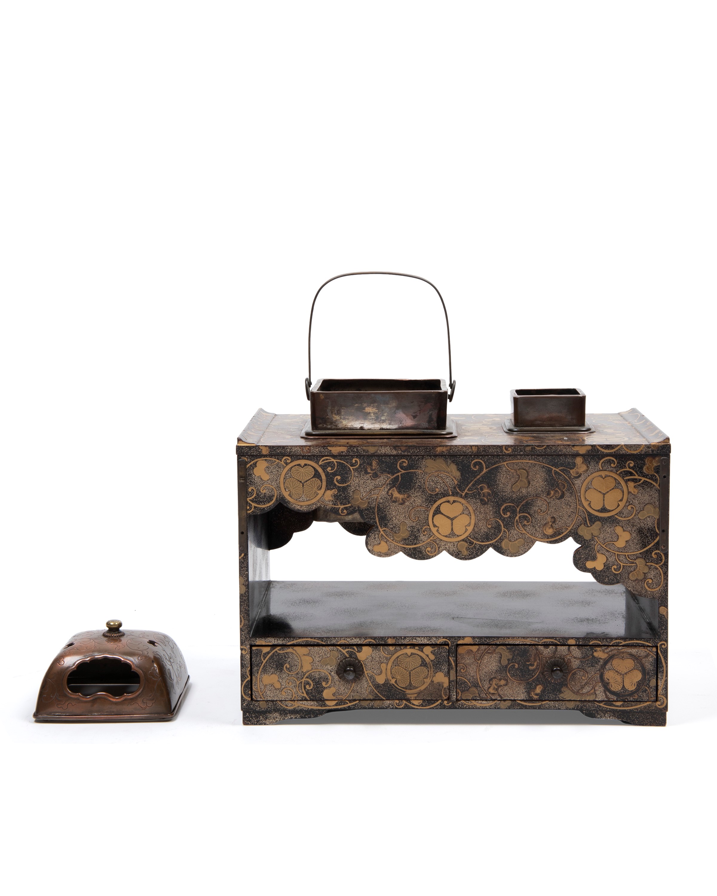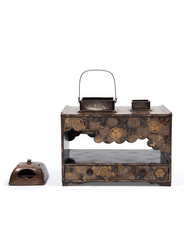 Two small drawers on the lower front. Decorated with mallow leaves in gold lacquer on a nashiji ground. On top, two removable copper braziers; the smaller one missing its lid.