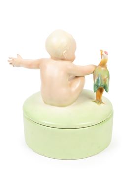 POLYCHROME EARTHENWARE BOX WITH CHILD AND ROOSTER, Turin, c. 1935