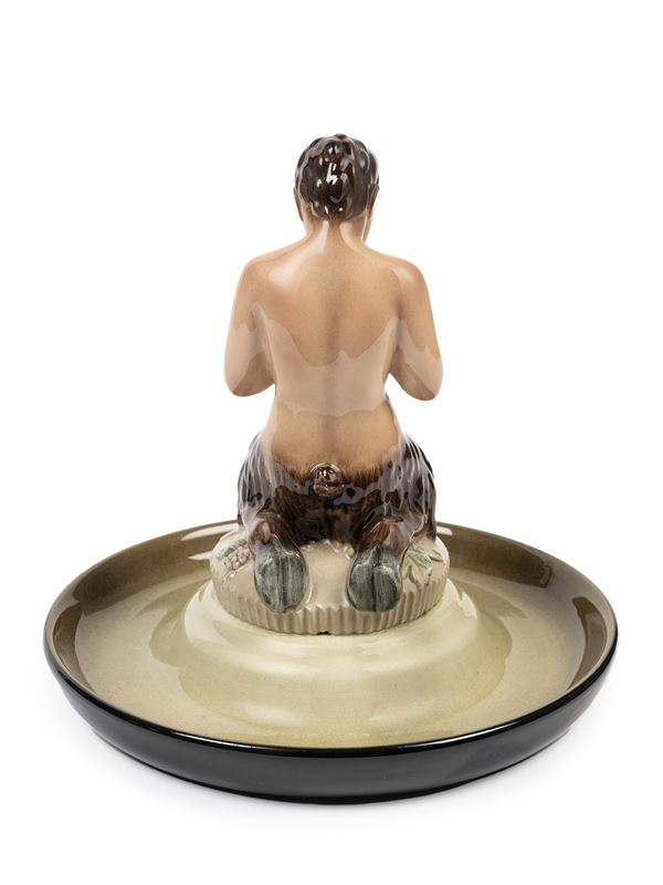 POLYCHROME EARTHENWARE SCULPTURE DEPICTING FAUN PLAYING ON A PLATE, Turin, 20th century
