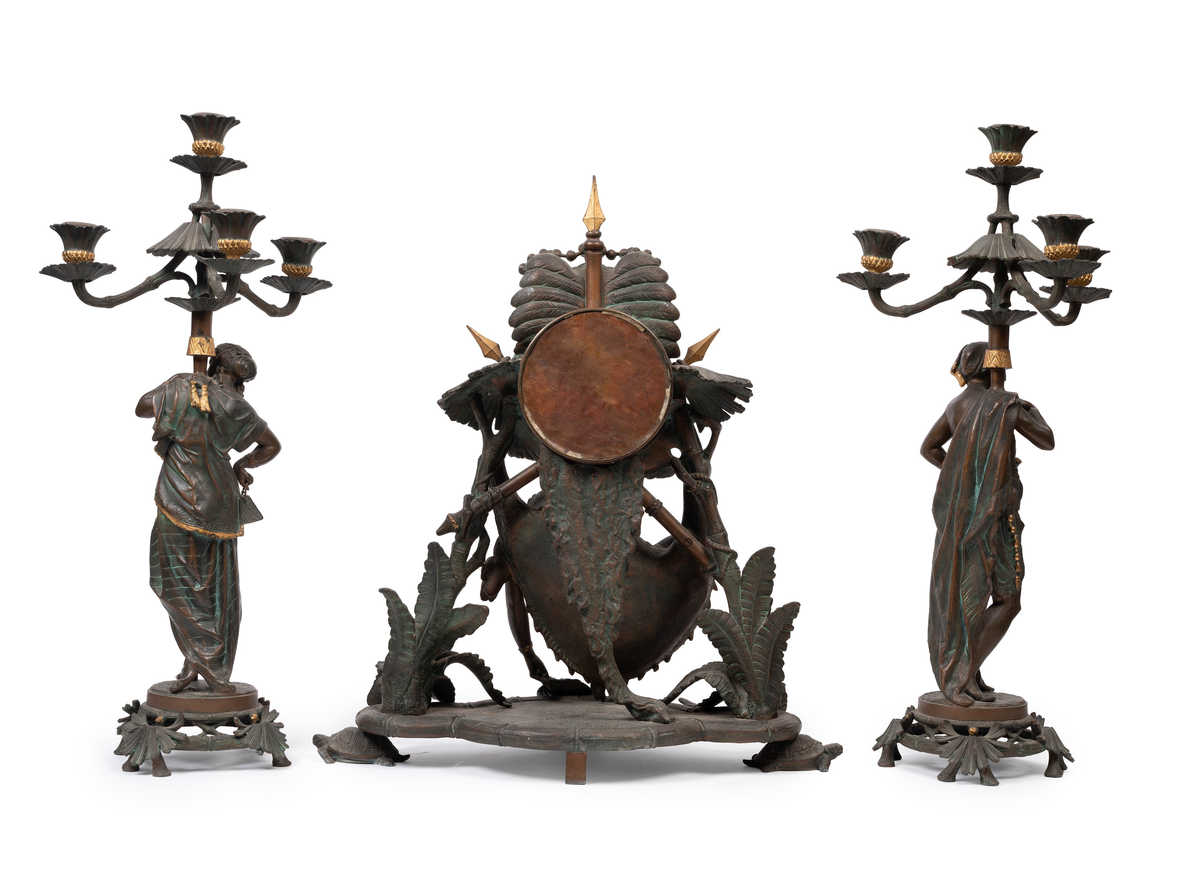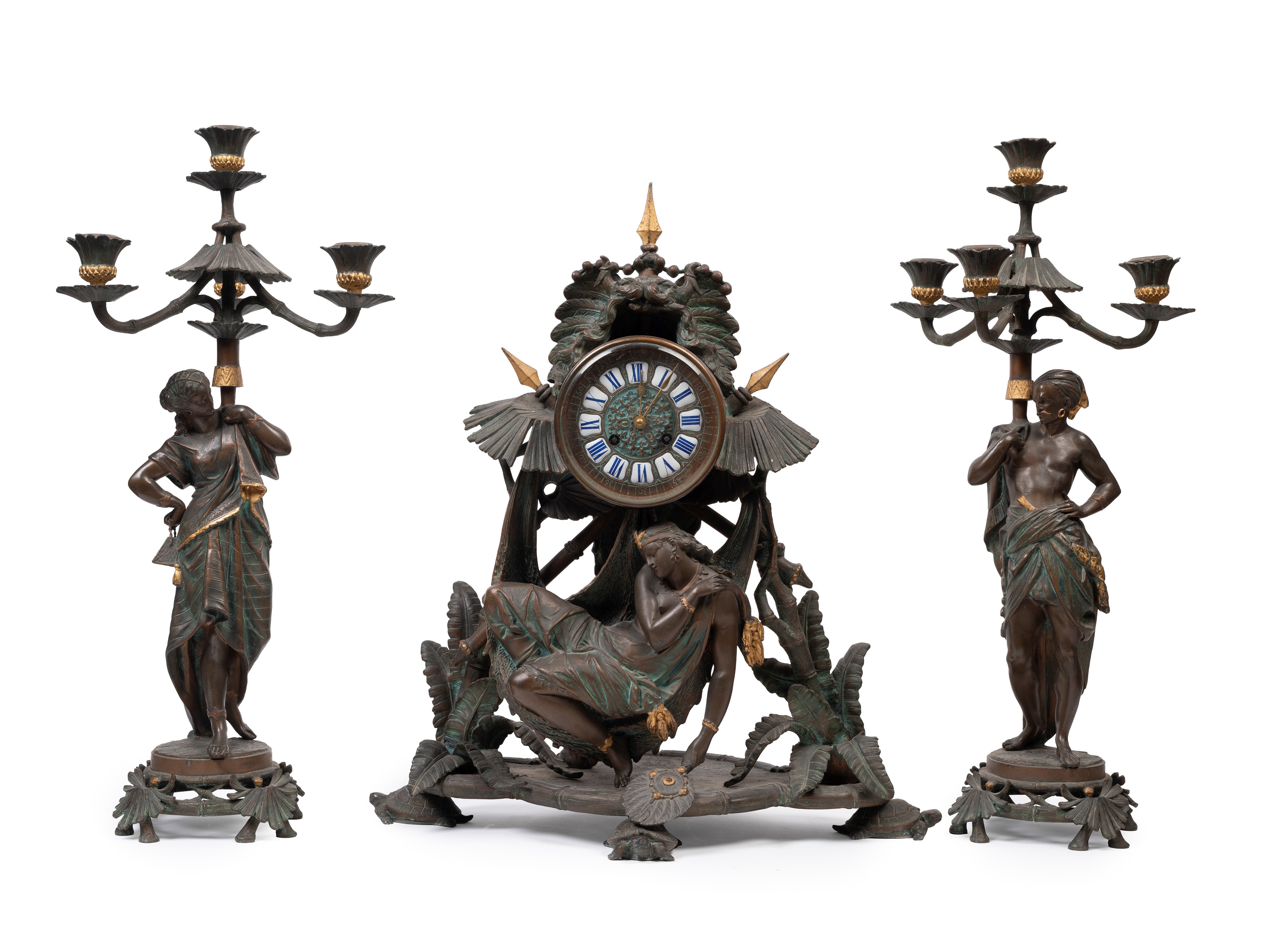 Mantel clock with reclining odalisque and turtle-shaped feet; two candlesticks supported by two Oriental figures.