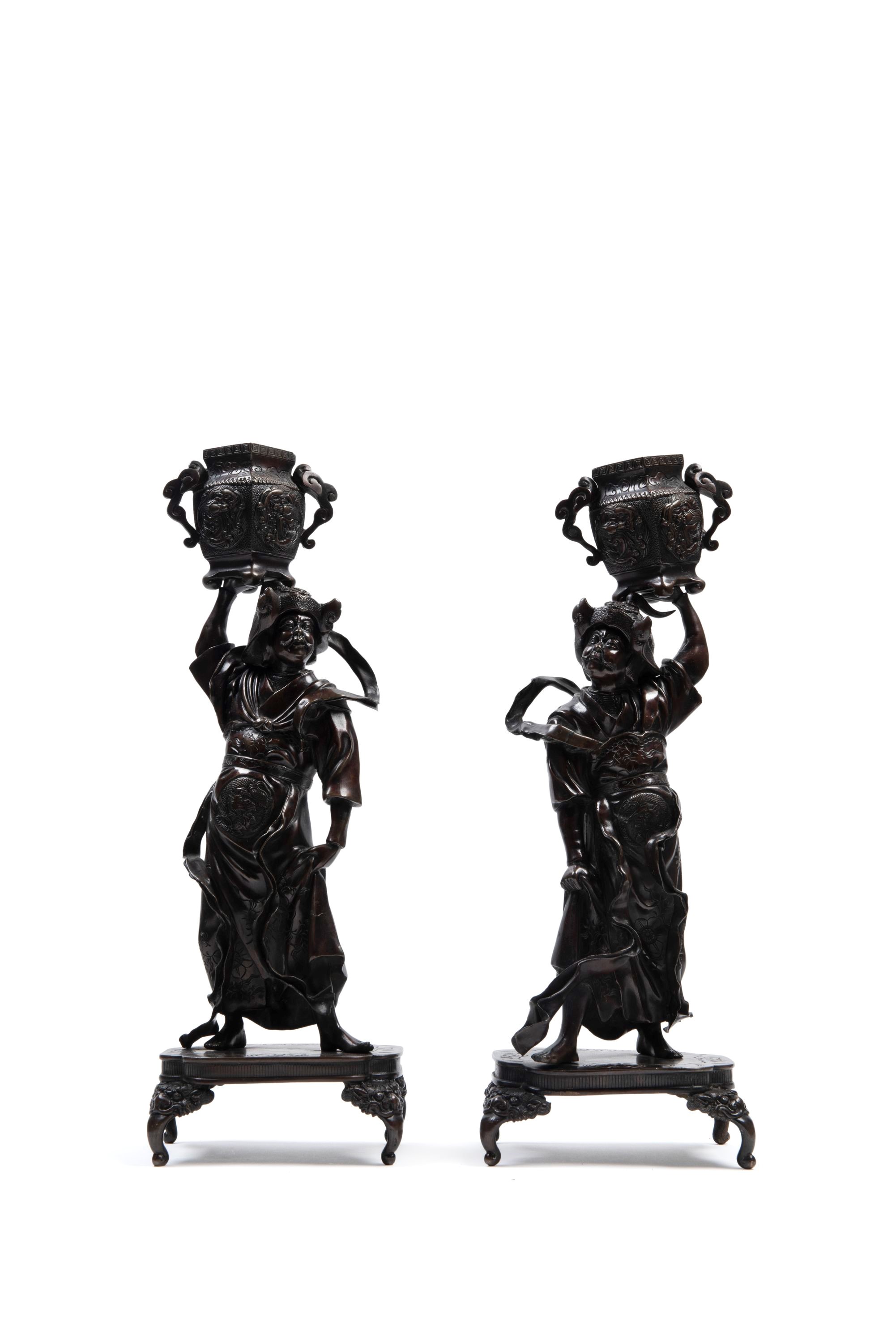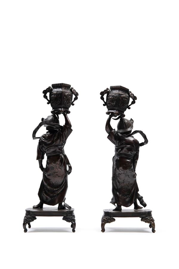Pair of bronze sculptures with dark patina depicting male figures, Japan, Meiji period (1868-1912)