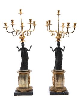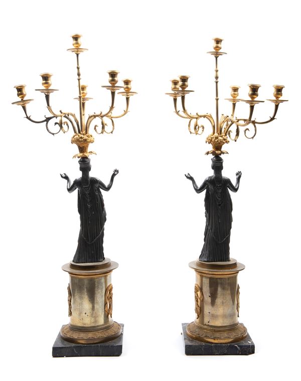 PAIR OF CANDELABRA IN BRONZE WITH DARK PATINA AND GILDING, France, late 19th century