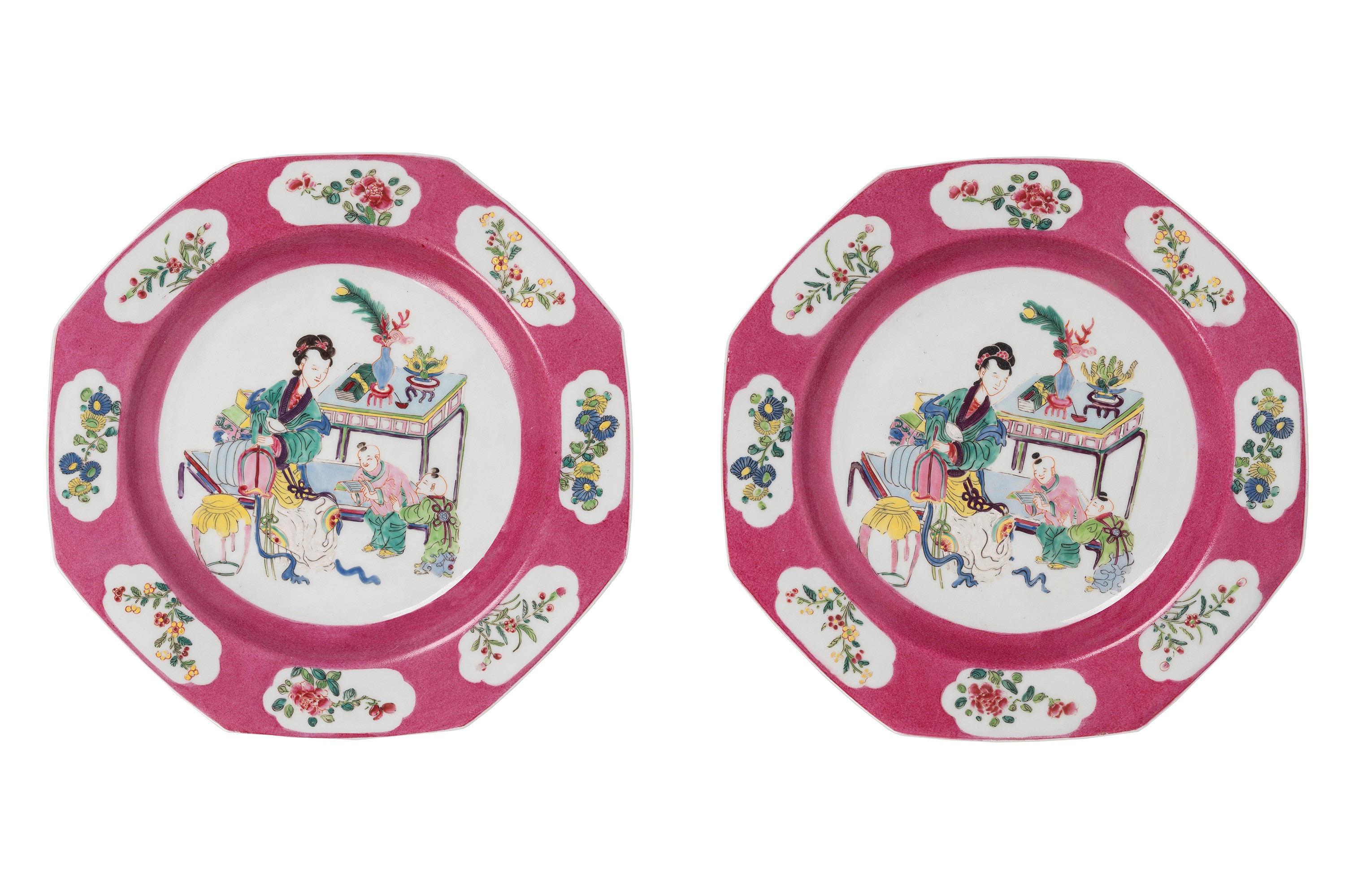 PAIR OF POLYCHROME PORCELAIN FAMILLE ROSE PLATES, France, 19th century