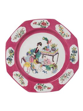 In the central medallion, a female figure with children playing; on the rim, decoration with floral motifs.