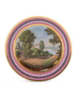 Pink-colored brim and gold edge, decorated with leaf motifs and white beads; cavetto painted with river landscape, village, hunter and onlookers.