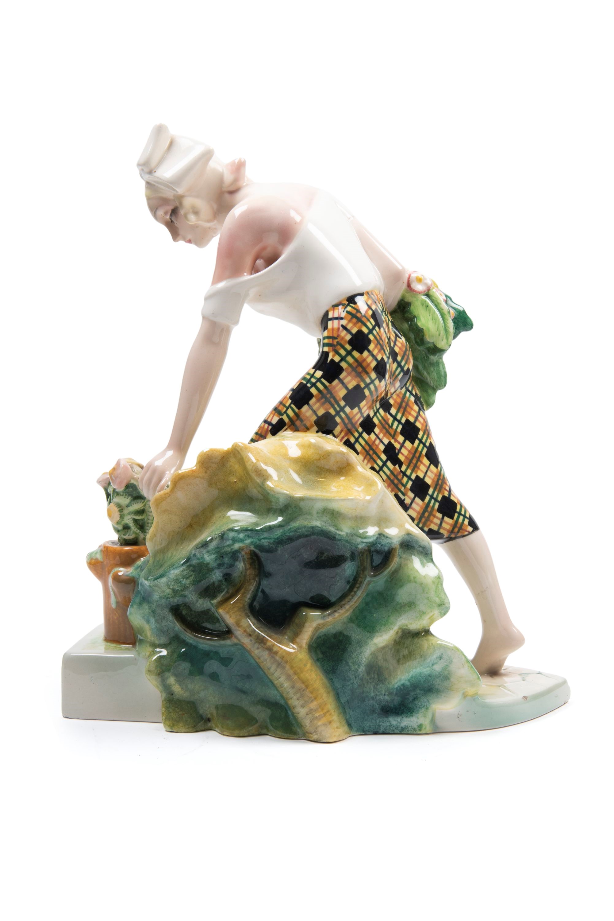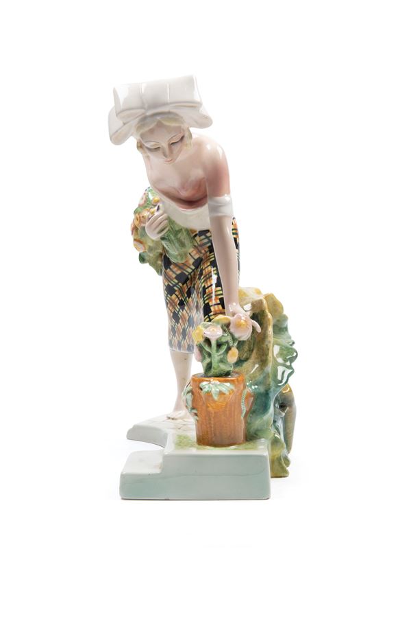 POLYCHROME EARTHENWARE SCULPTURE DEPICTING A FLOWER SELLER, Turin, 20th century