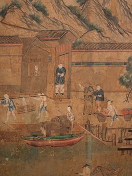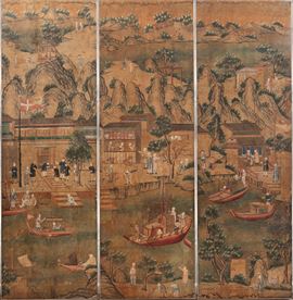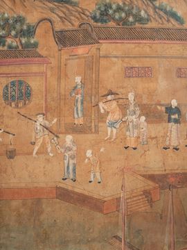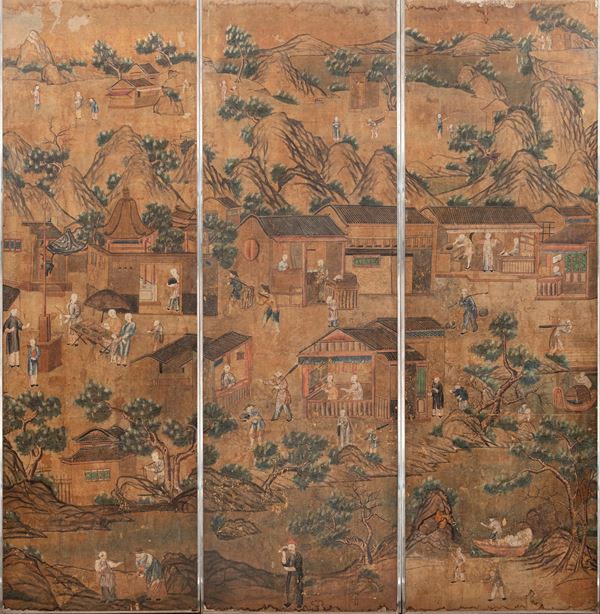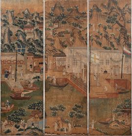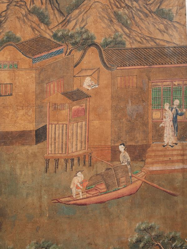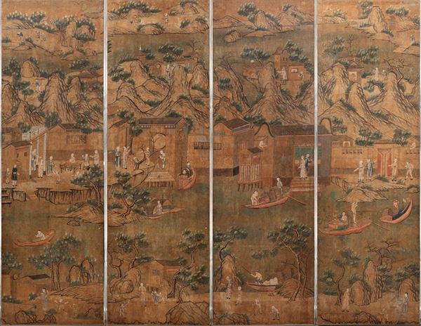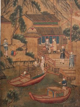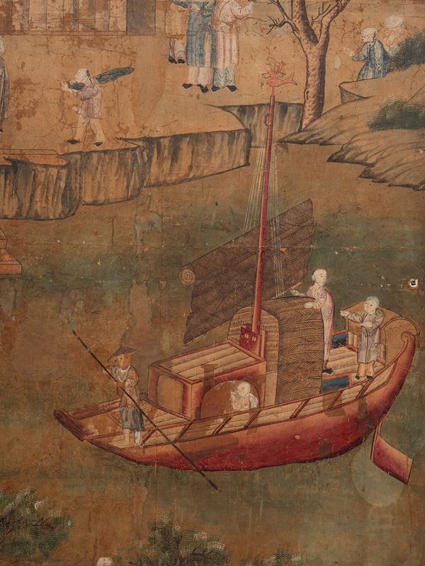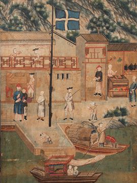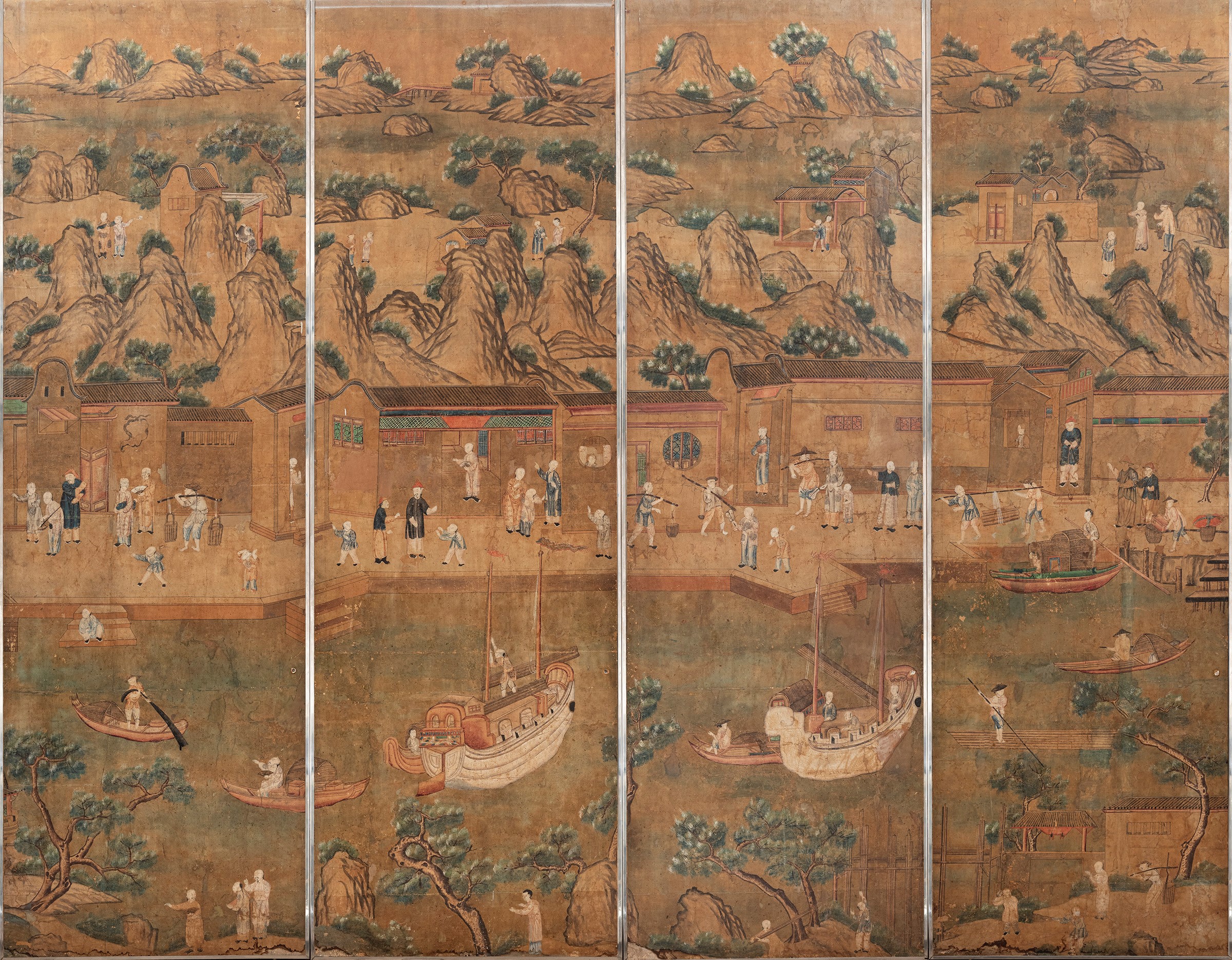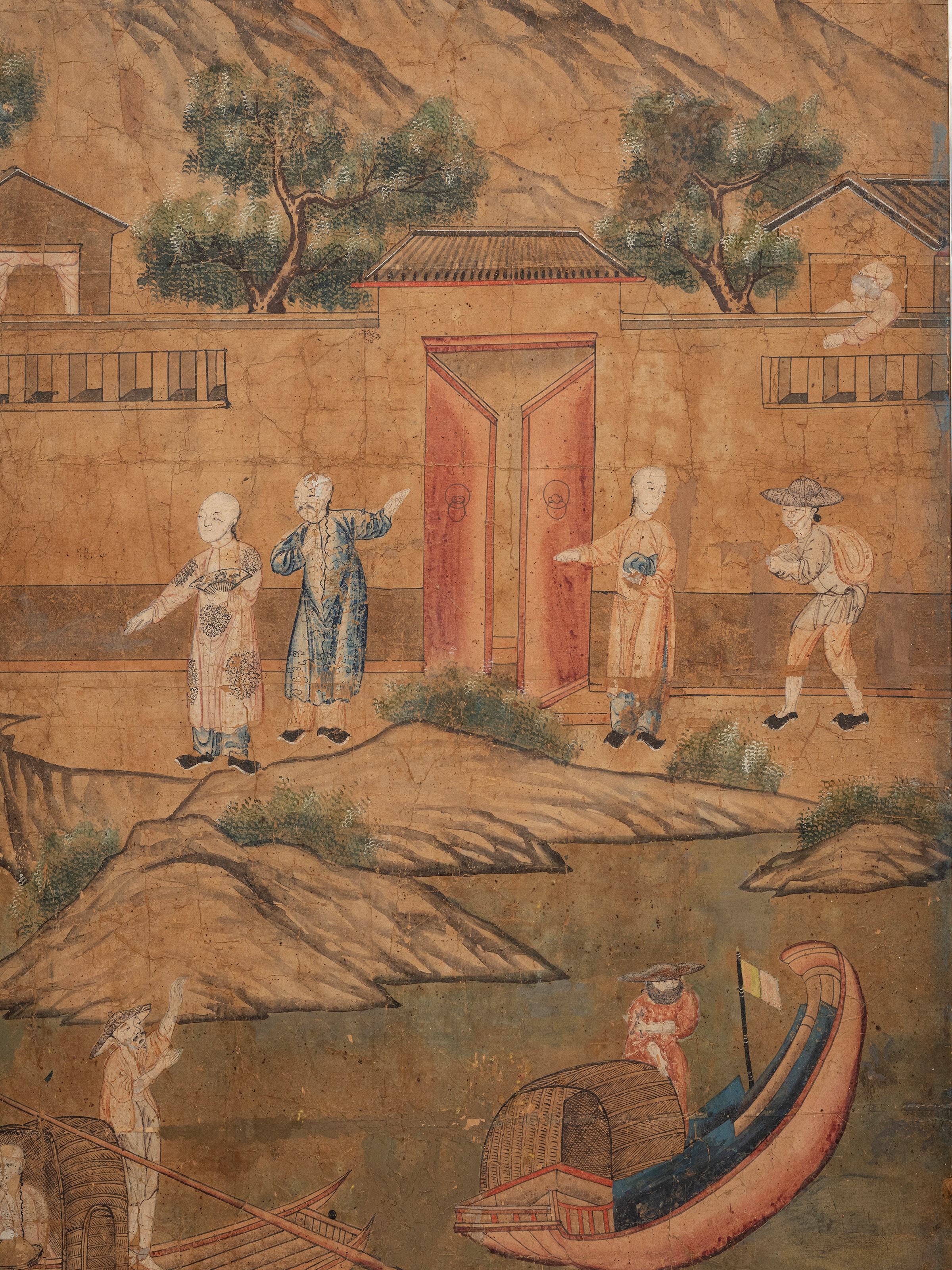 Finely painted, they depict a view of the Hongs along the port of Canton, animated in the foreground by numerous boats navigating the Pearl River, with fishermen, merchants, westerners and various labourers engaged in their activities. Along the shore stand the buildings of the foreign trading companies, distinguished by their respective flags, with a mountainous landscape dotted with pagodas in the background.