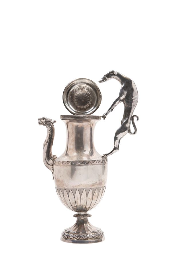 Acorn-shaped handle, spout ending with zoomorphic figure, greyhound-shaped handle and body decorated with waves and leaves. Weight 1,415 g.