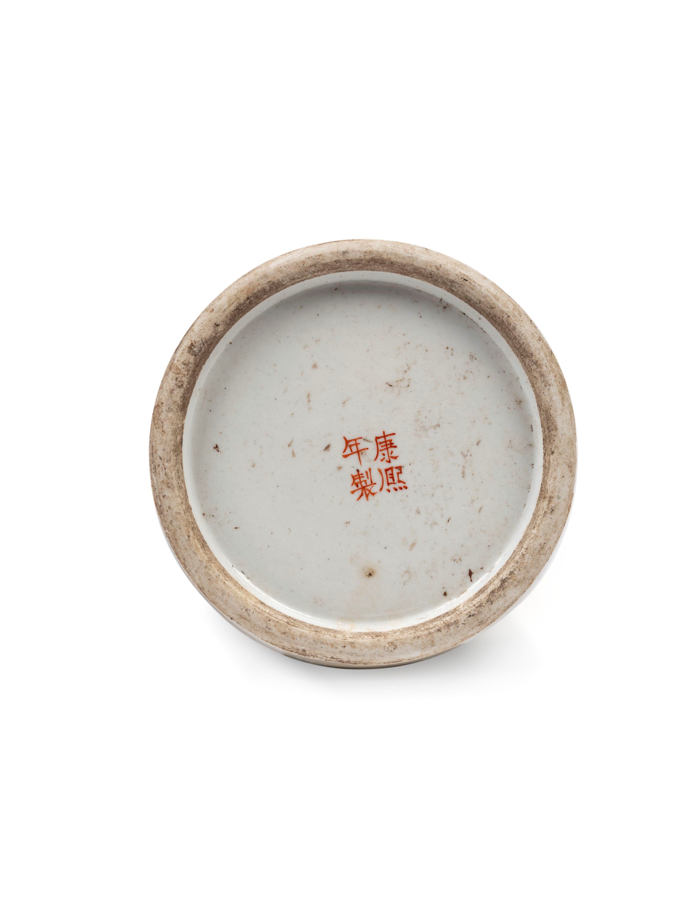 Baluster-shaped, they are painted with ladies playing in a garden; at the base they bear an apocryphal four-character mark of Emperor Kangxi (defects).