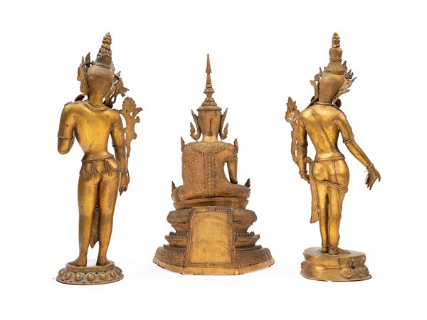 Depicting a Thai Buddha in Rattanakosin style seated on a throne, accompanied by two bodhisattvas.