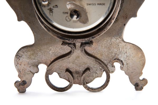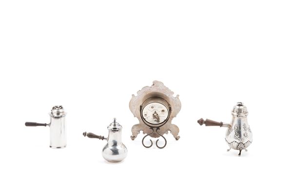 THREE MINIATURE COFFEE POTS AND SILVER CLOCK, Italy, 20th century