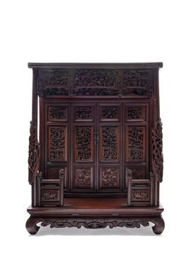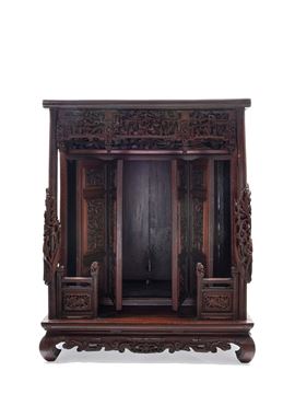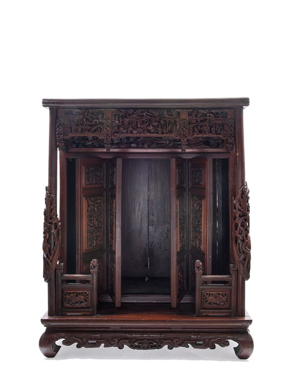 Finely carved. On the front four openable doors decorated with Taoist scenes, landscapes with pagodas and figures.