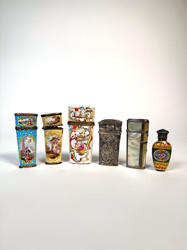 Comprising a travel cutlery case in enamelled porcelain; an enamelled perfume bottle with floral motifs; four nécessaires, of which two enamelled and decorated with reserve panels; one in mother-of-pearl and one repoussé with chivalric motifs.