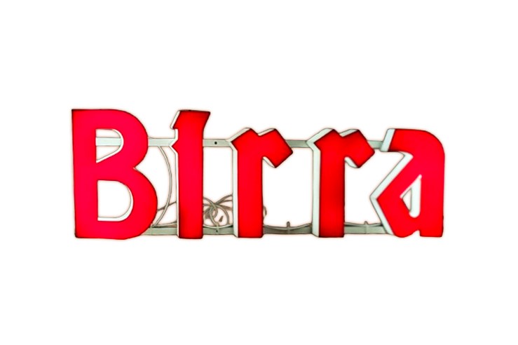 Box-shaped letters made of red plexiglass with a metal frame and the word “Birra.” Neon lighting typical of the 1960s and 1970s. Vintage sign with a metal frame
